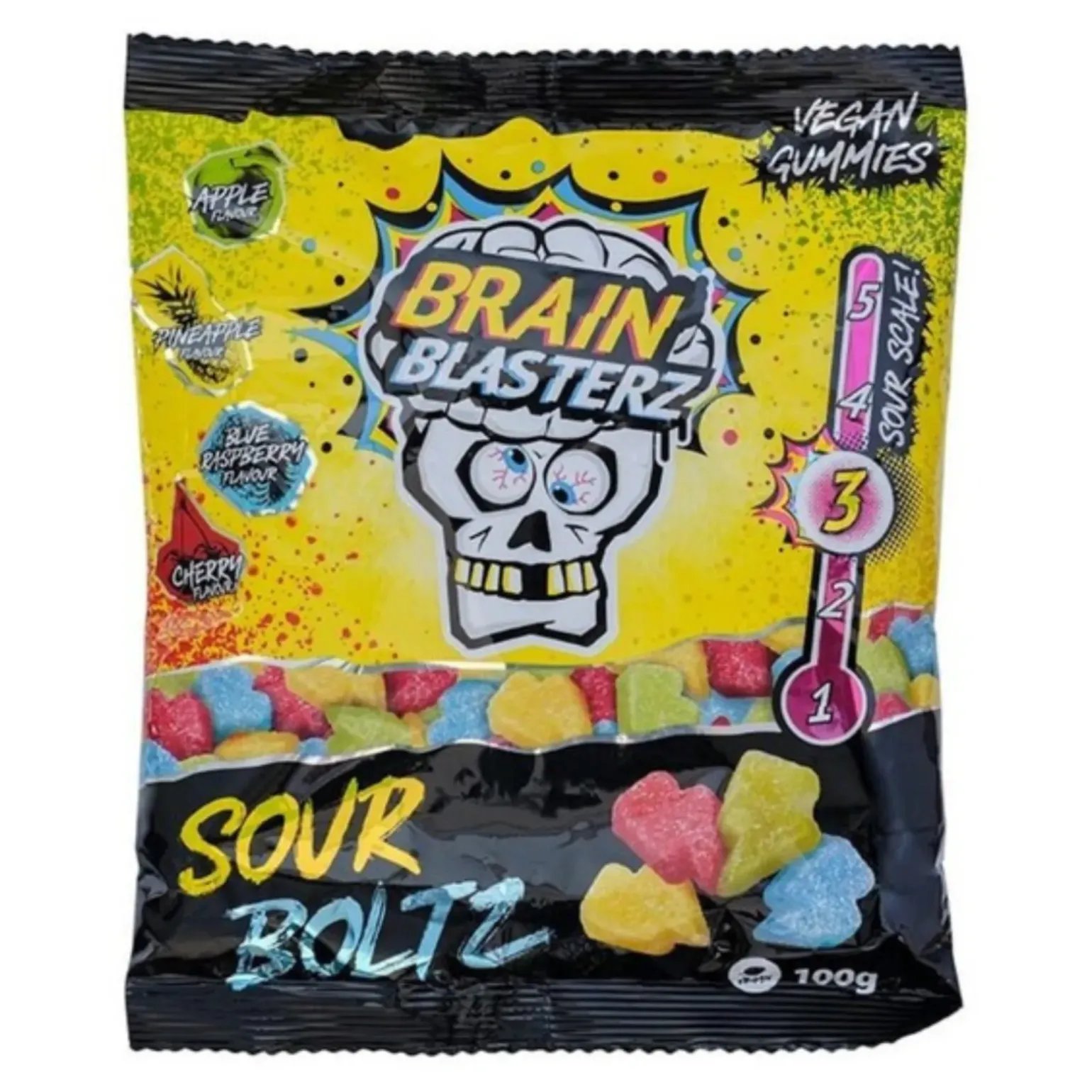 Brain Blasterz Sour Boltz zakje (16×100 g) zijn intens zure snoepstrips met een fruitige smaak en een opvallend zuur suikerlaagje. Deze kleurrijke candy bolts staan bekend om hun krachtige zure kick, gevolgd door een zoete fruitsmaak. Ideaal voor liefhebbers van extreem zuur snoep. De doos bevat 16 zakjes van 100 gram, geschikt voor wederverkoop, impulsaankopen of als aanvulling in het zure snoepschap. Brain Blasterz is internationaal bekend om zijn uitgesproken zure snoepassortiment.