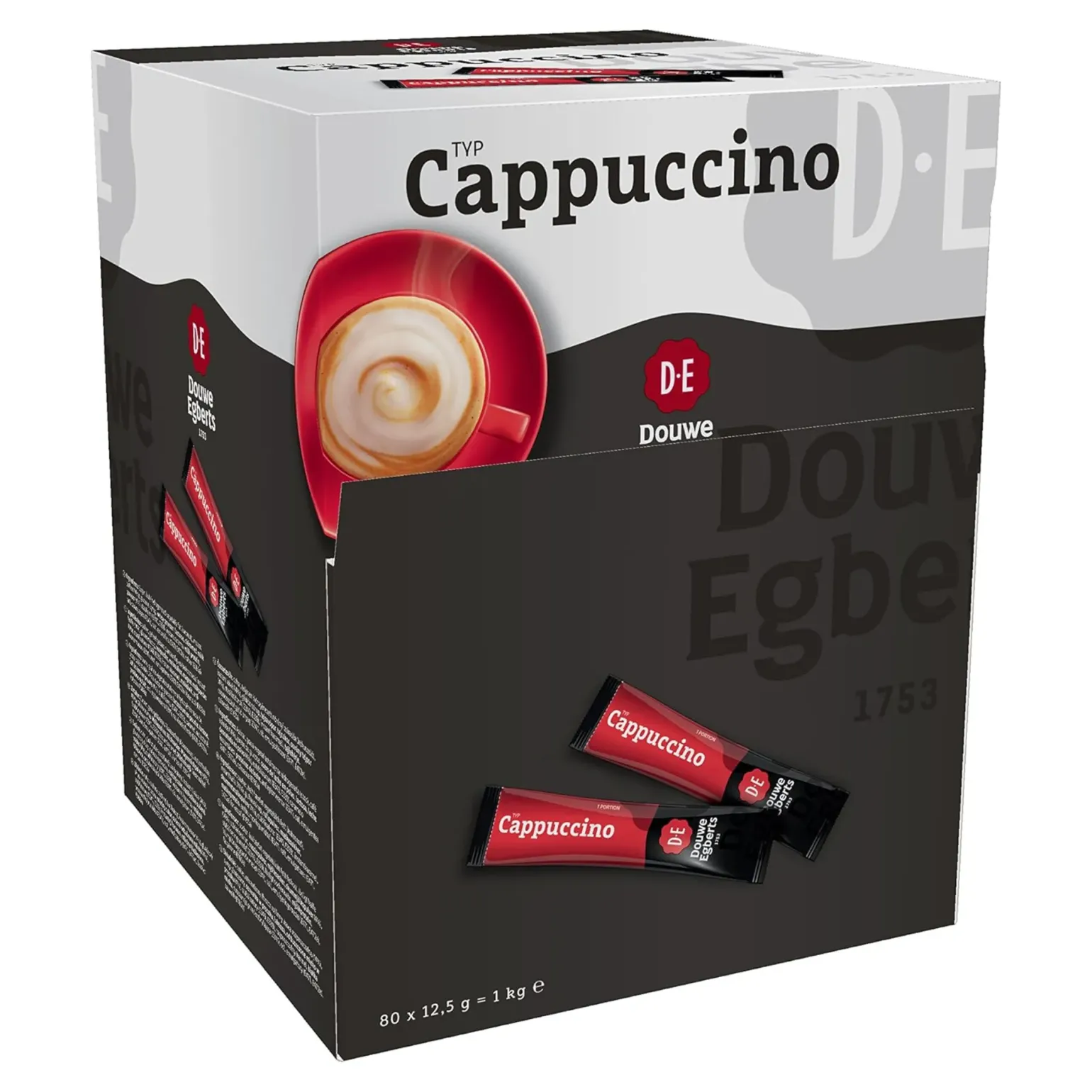 De Douwe Egberts cappuccino sticks zorgen voor een echte Italiaanse koffie met een heerlijke schuimlaag op elk kopje koffie. De praktische dispenserdoos bevat 80 sticks waarmee u eenvoudig op elk tijdstip een lekkere cappuccino kunt maken. De inhoud van één stick is 9,5 gram hetgeen goed is voor 125 ml cappuccino. Doordat de per stuk verpakte oploskoffie in een handige displaydoos zitten kan je deze mooi presenteren naast de koffiemachine in jouw kantine, restaurant of wachtruimte. Douwe Egberts cappuccinosticks koop je natuurlijk voordelig per dispenserdoos met 80 cappuccinosticks van 9,5 gram bij online groothandel Compliment.nl.