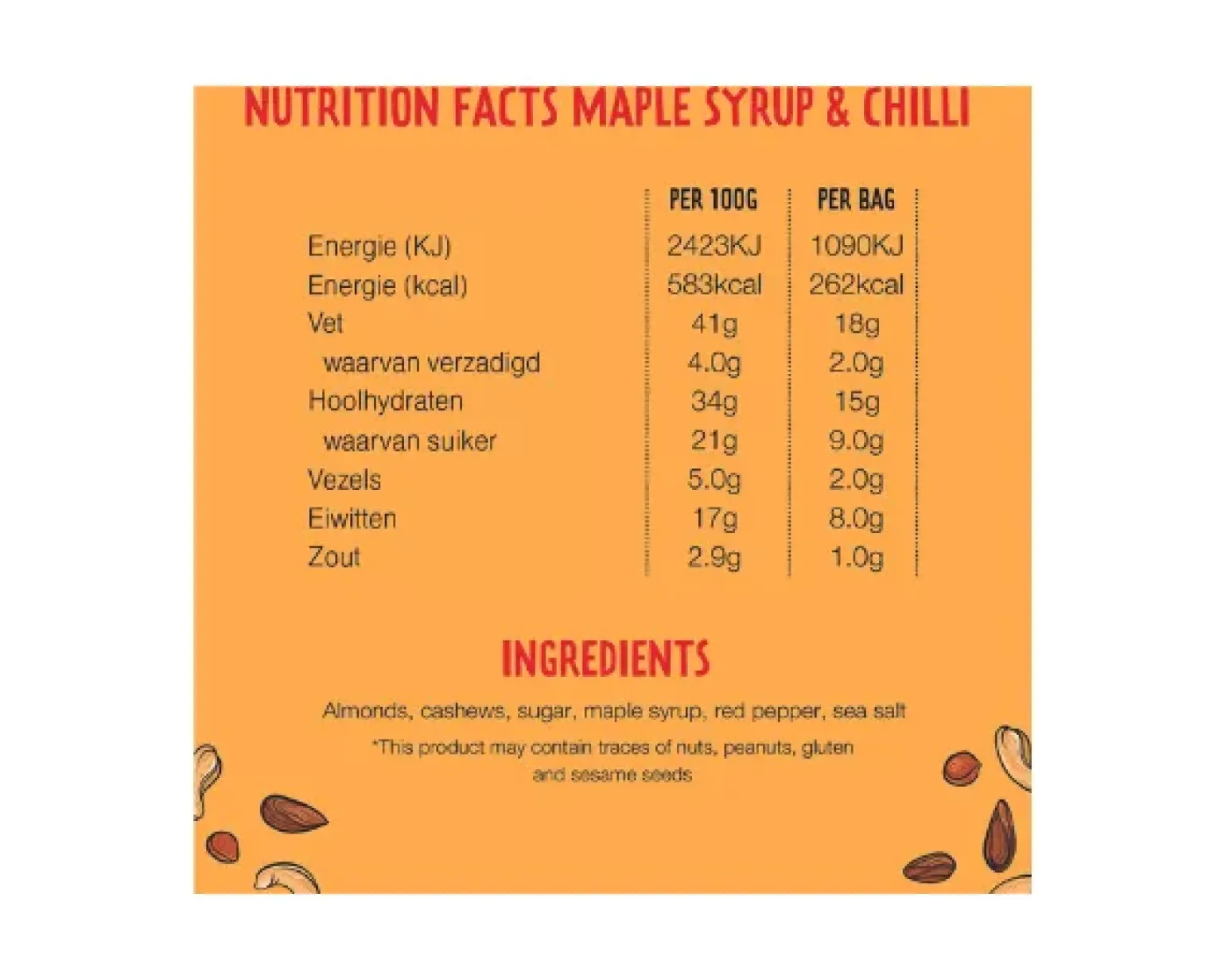 Ingrediënten: cashewnoten, amandelen, suiker, maple siroop, rode peper, zeezout.