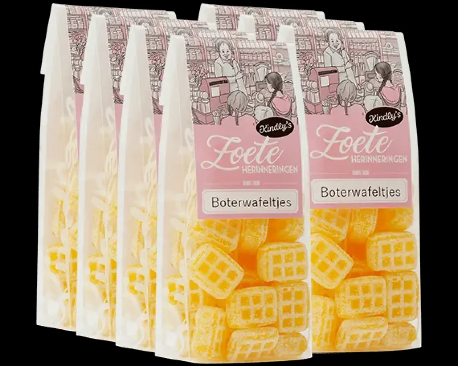 Kindly’s boterwafeltjes zijn harde snoepjes met een zachte, romige smaak. De zoete snoepjes laten je wegdromen in zoete herinneringen. De romige boterwafels zitten in een mooie verpakking. Leuk om zelf te verkopen, of om uit te delen als traktatie of relatiegeschenk. Voordelig Kindly’s boterwafels kopen doe je natuurlijk bij online snoepgroothandel Compliment.nl. Je koopt Kindly’s boterwafeltjes per doos met 7 zakjes van 200 gram.