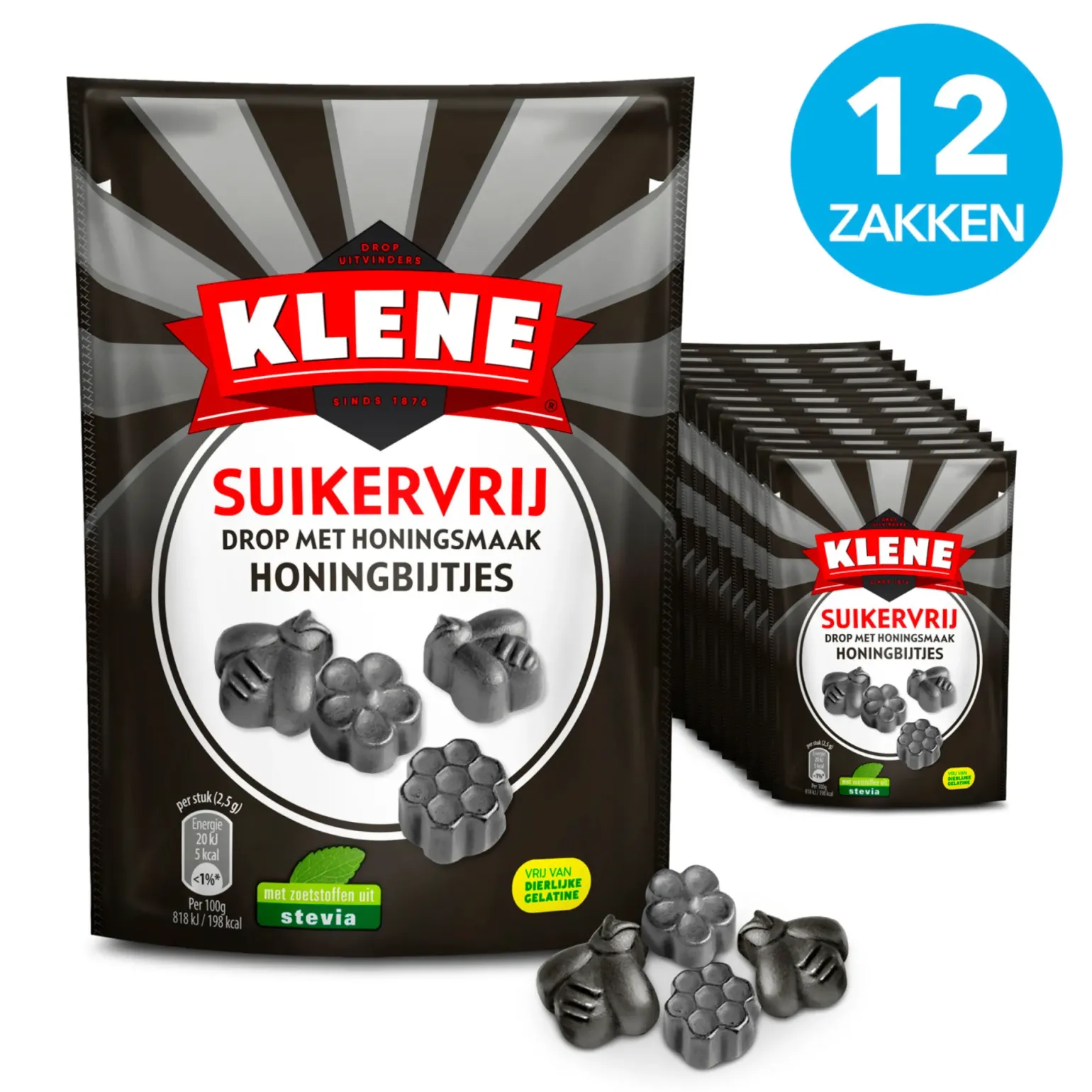 Honingbijtjes drop van Klene zijn heerlijke dropjes met honingsmaak. De onweerstaanbare smaak van honingdrop is bekend bij elke dropliefhebber. De honingdropjes van Klene hebben toepasselijke voren van bijtjes en honingraadjes. De dropjes zijn bereid volgens het authentieke recept van Klene, met echte Arabische gom. Gemaakt zonder dierlijke gelatine en gezoet met stevia dus helemaal suikervrij. Voordelig honingdrop kopen doe je natuurlijk bij online snoepgroothandel Compliment.nl. Je koopt Klene suikervrije honingbijtjes per doos met 12 zakken van 110 gram honingdropjes.