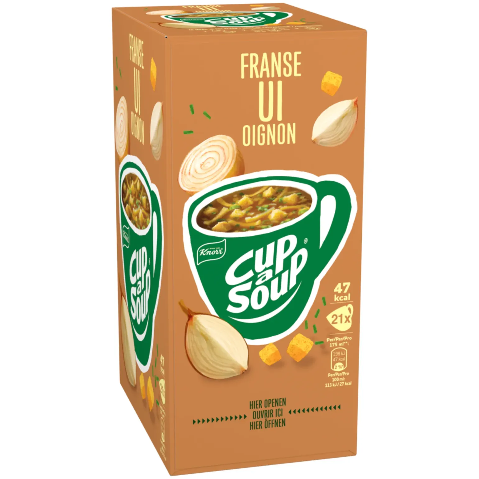 Knorr Cup-a-Soup Franse Ui is een hartige instant moksoep met de karakteristieke smaak van klassieke Franse uiensoep. De soep combineert ui met knapperige croutons en pannenkoekreepjes voor extra structuur en een volle smaak. Ideaal als warm tussendoortje tijdens een drukke werkdag, op kantoor of thuis. Met de handige portiezakjes maak je in een minuut een mok soep: voeg simpelweg 175 ml kokend water toe en roer even door. De doos bevat 21 zakjes en is daardoor geschikt voor kantines, werkplekken of thuisgebruik.