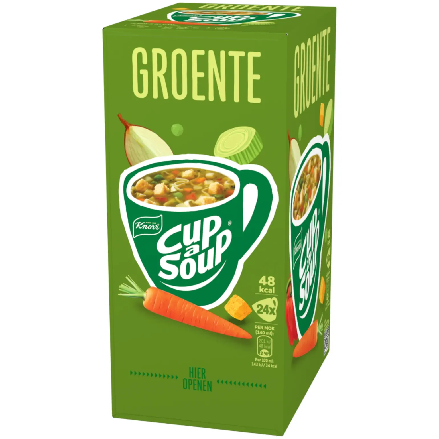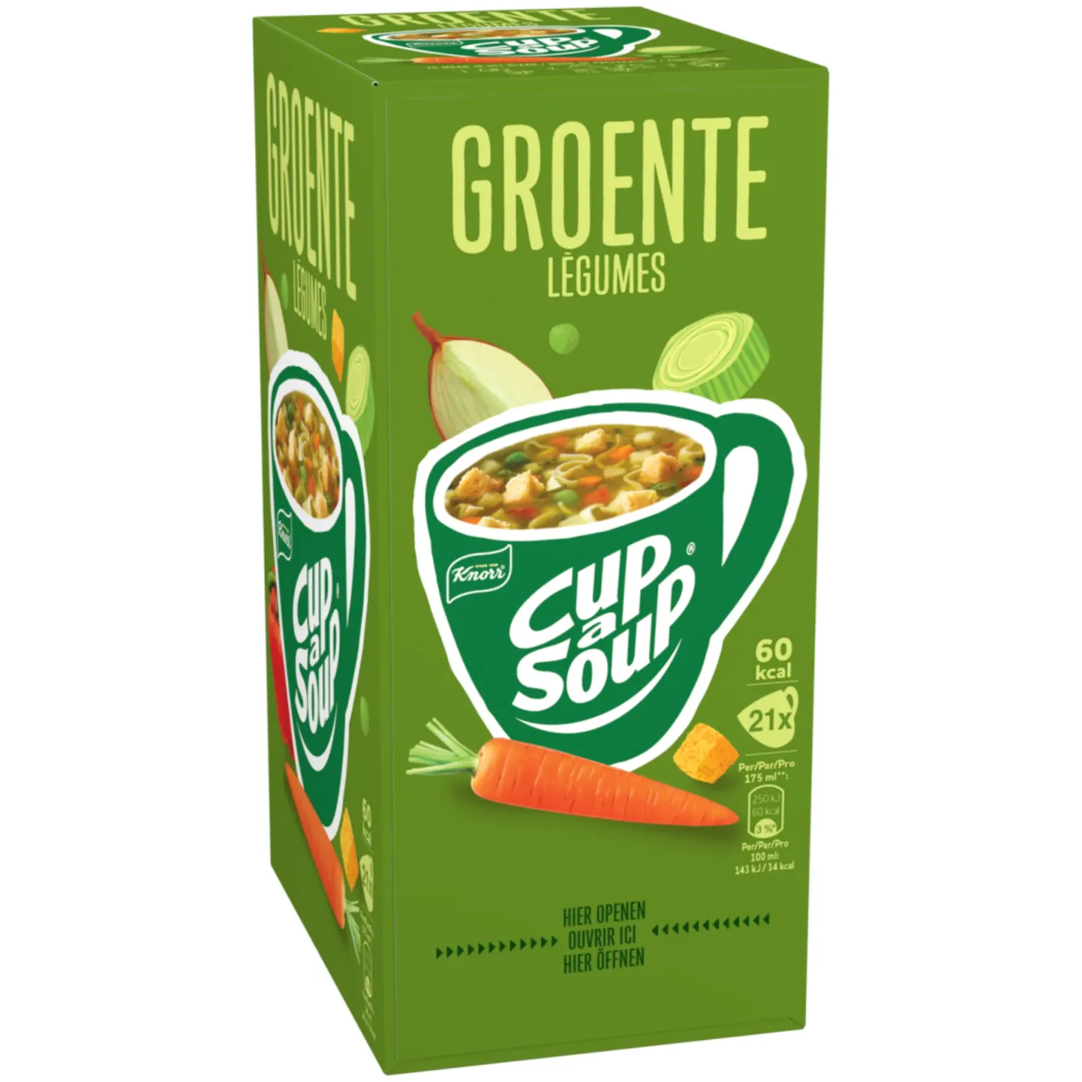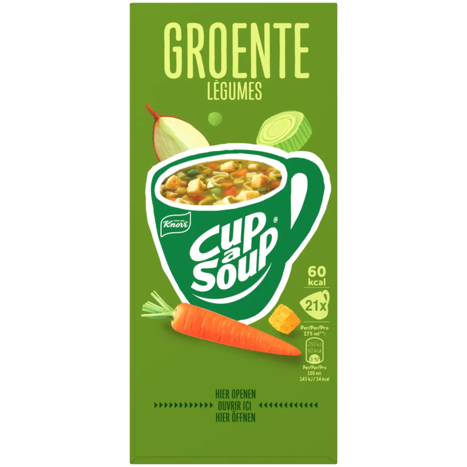 Knorr Cup-a-Soup Groente is een hartige instant moksoep met een rijke mix van groenten. Deze soep combineert onder andere wortel, prei, ui en kruiden voor een volle en verwarmende smaak. Ideaal als warm tussendoortje tijdens een drukke werkdag of een korte pauze. Dankzij de handige portiezakjes maak je in een minuut een mok soep: voeg simpelweg kokend water toe en roer even door. De verpakking bevat 21 zakjes en is daardoor perfect voor kantines, werkplekken of als praktische voorraad thuis.