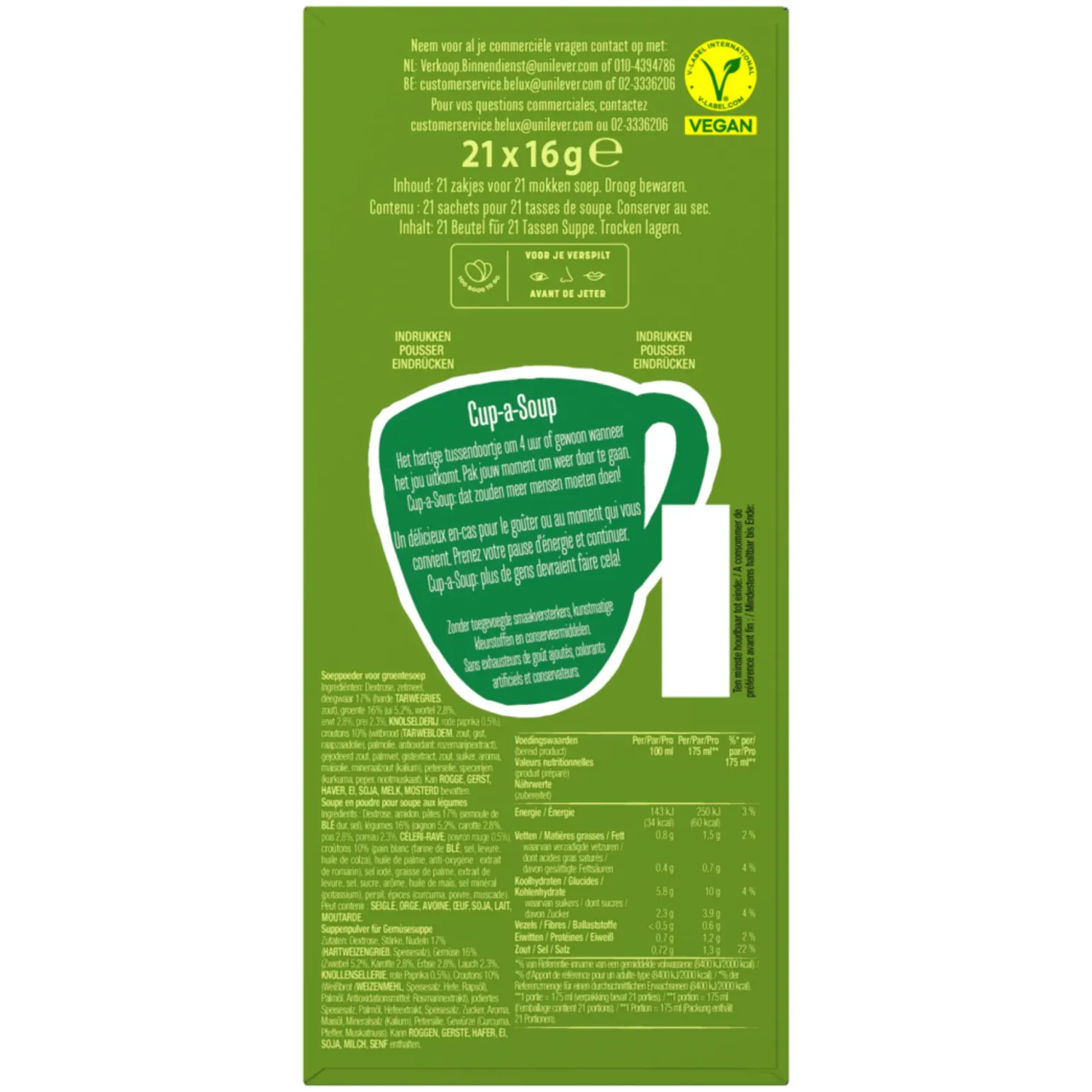 Dextrose, zetmeel, deegwaar 17% (harde TARWEGRIES, zout), groente 16% (ui 5,2%, wortel 2,8%, erwt 2,8%, prei 2,3%, KNOLSELDERIJ, rode paprika 0,5%), croutons 10% (witbrood (TARWEBLOEM, zout, gist, raapzaadolie), palmolie, antioxidant: rozemarijnextract), gejodeerd zout, palmvet, gistextract, zout, suiker, aroma, maïsolie, mineraalzout (kalium), peterselie, specerijen (kurkuma, peper, nootmuskaat). Kan ROGGE, GERST, HAVER, EI, SOJA, MELK, MOSTERD bevatten.