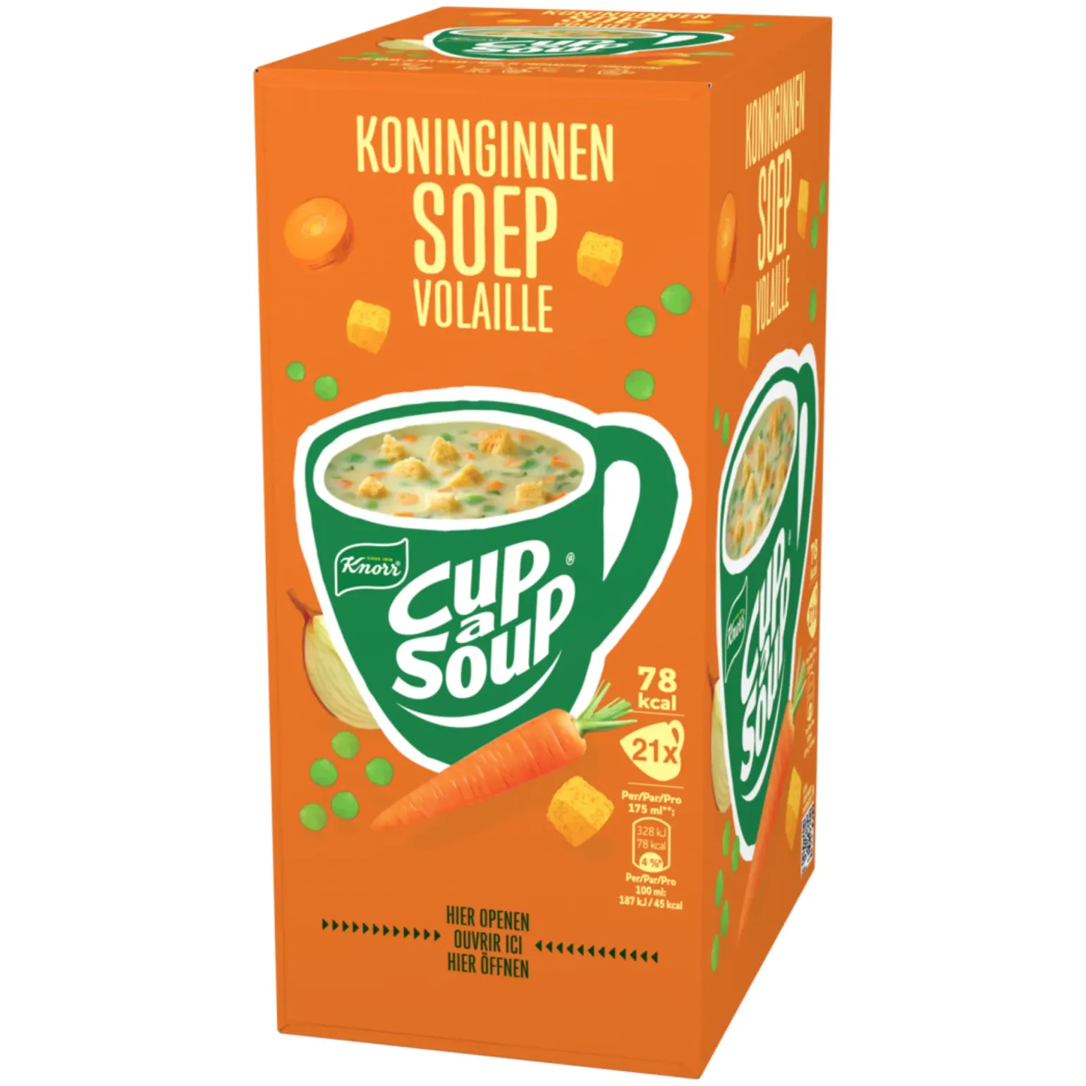 Knorr Cup-a-Soup Koninginnensoep is een romige klassieker met een zachte, verfijnde smaak. Ideaal voor wie tijdens een drukke dag even wil genieten van een warm en mild tussendoortje. Deze soep is binnen één minuut klaar met heet water en daardoor perfect voor kantoor, kantine of horeca. Dankzij de handige portiezakjes maak je altijd precies genoeg, zonder verspilling. Met 21 zakjes per doos heb je een praktische voorraad voor meerdere momenten.