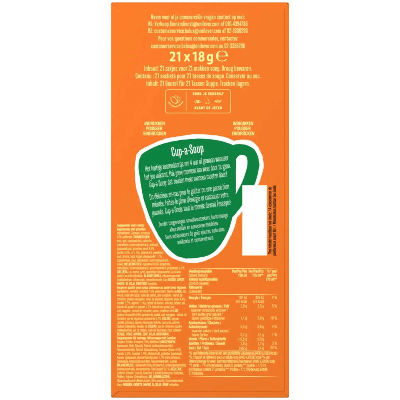 Zetmeel, croutons 15% (witbrood (TARWEBLOEM, zout, gist, raapzaadolie), palmolie, antioxidant: rozemarijnextract), palmvet, glucosestroop, groenten (erwt 4,4%, wortel 3,3%, ui 1,1%), gistextract, gejodeerd zout, aroma, zout, kippenvleespoeder 1,7% (kippenvlees, zout, antioxidant: rozemarijnextract), suiker, MELKEIWITTEN, kippenvet 0,8% (kippenvet, antioxidant: rozemarijnextract), geconcentreerd groentesap 0,7% (SELDERIJ, ui, wortel, prei), specerijen (lavaswortel, kurkuma, peper), kruiden (bieslook, BLADSELDERIJ), citroensappoeder (maltodextrine, citroensap), zonnebloemolie. Kan ROGGE, GERST, HAVER, EI, SOJA, MOSTERD bevatten.