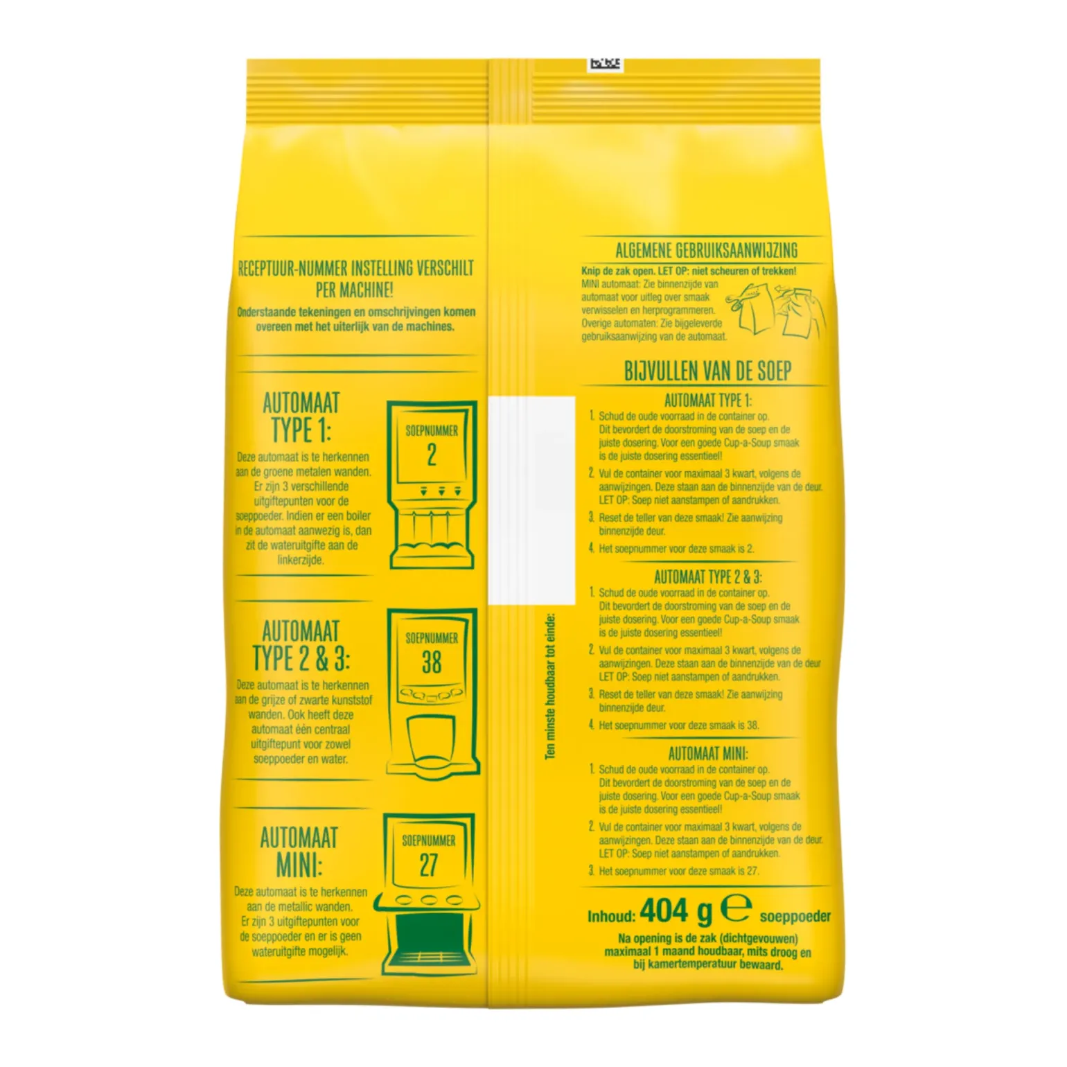 Knorr Cup-a-Soup Vendingzak Kip (40-porties) is speciaal ontwikkeld voor gebruik in soepautomaten en vendingmachines. Deze instant soep heeft een hartige kipsmaak en zorgt voor een warme, snelle opkikker tijdens werkpauzes. De vendingzak bevat voldoende poeder voor circa 40 porties soep, waardoor hij ideaal is voor kantines, bedrijven en andere locaties met een hoge doorloop. De soep wordt automatisch gedoseerd door de automaat en levert per portie een smaakvolle mok soep met de herkenbare kwaliteit van Knorr.