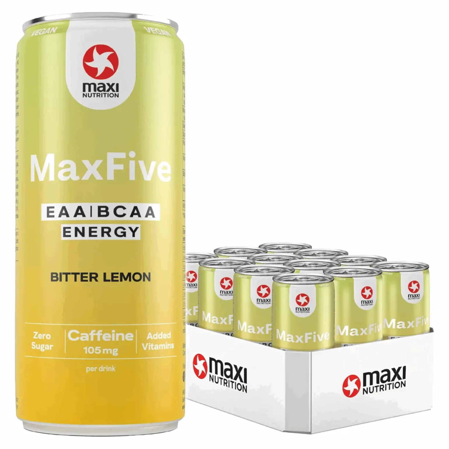 Bij Compliment.nl koop je voordelig de MaxiNutrition MaxFive Energy Drink Bitter Lemon (12×330 ml), een sprankelend en verfrissend drankje met een bitter‑zoete citroensmaak dat functioneel ondersteunt tijdens je sportmomenten of een drukke dag. Deze vegan EAA/BCAA-drank bevat maar liefst 5 g essentiële aminozuren (waarvan 3 g BCAAs in een optimale 2:1:1 verhouding), aangevuld met energiegevende vitaminen B5, B6, B7 en B12 én een stevige dosis cafeïne (105 mg per blik) uit groene koffiebonen. Zo geef je je lichaam een heldere, suikervrije boost zonder kunstmatige toevoegingen, perfect voor die momenten waarop je fris en energiek wilt blijven.