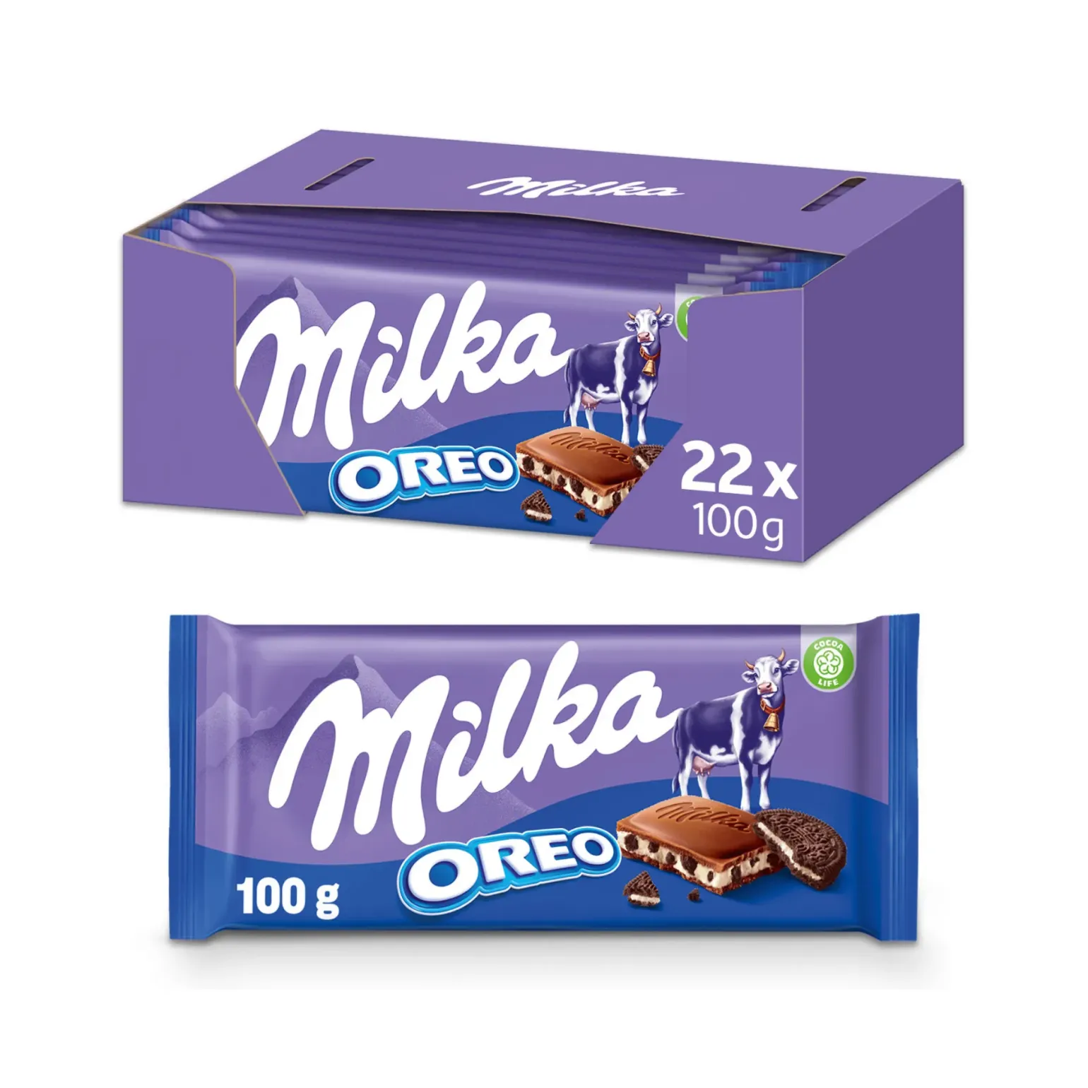 Milka Oreo is een tablet van heerlijke Alpenmelkchocolade gevuld met melkcréme en knapperige stukjes van Oreo koekjes. Deze Milka Oreo zorgt voor een krokante bite en is heerlijk om te delen, jezelf mee te verwennen of om te trakteren. Er zitten 22 repen á 100 gram in een doos.