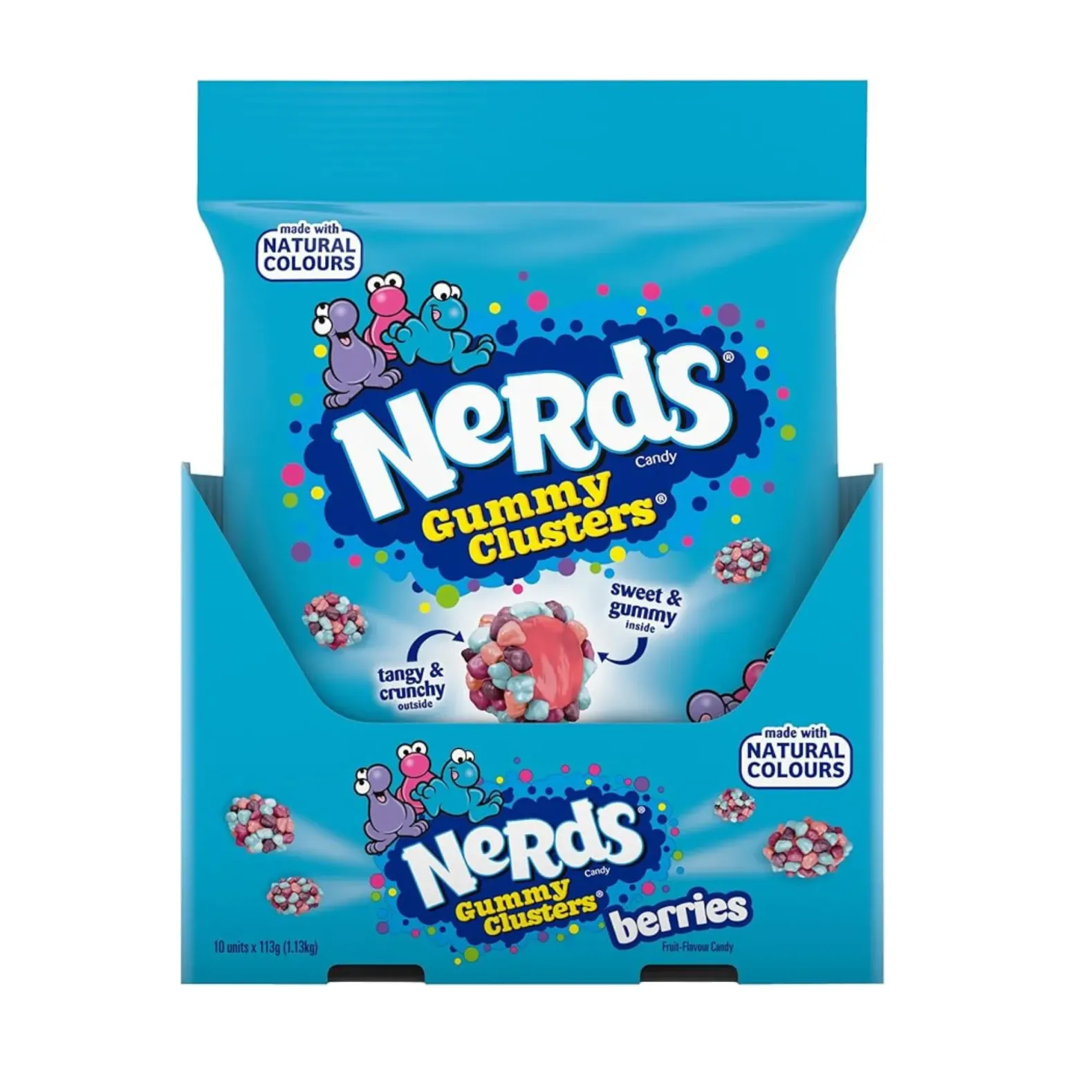 Nerds Gummy Clusters Berry (24×85 gram) zijn zachte fruitgummies omhuld met kleurrijke, knapperige Nerds-snoepjes. De combinatie van chewy gummy en krokante candy stukjes zorgt voor een unieke textuur en een uitgesproken bessenmix van zoete en lichtzure smaken. Deze populaire Amerikaanse snack staat bekend om zijn speelse structuur en intense fruitsmaak. De doos bevat 24 zakjes van 85 gram, ideaal voor wederverkoop, impulsaankopen of als opvallend product in het internationale snoepschap.