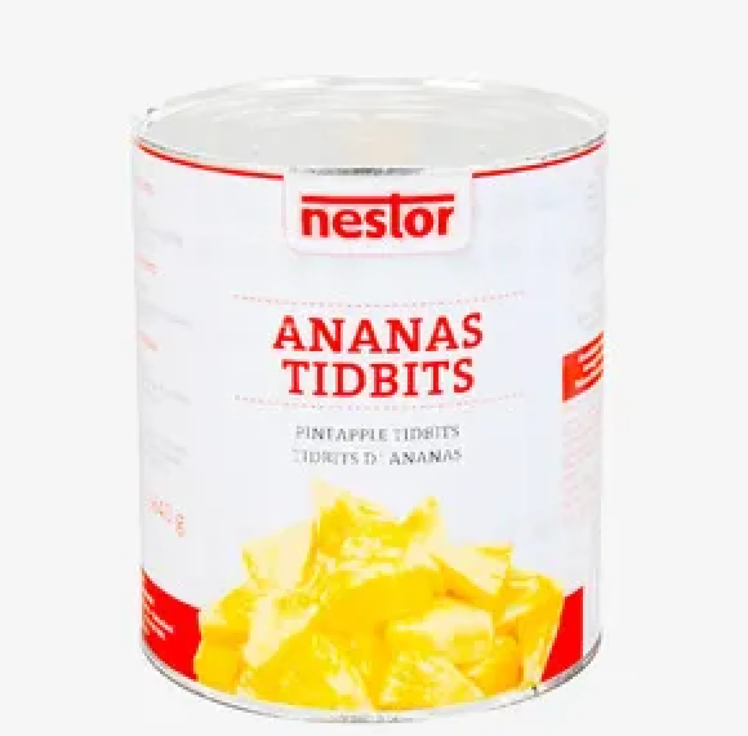 Nestor Ananas Tidbits is een blik met sappige stukjes ananas in een lichte siroop. Deze zorgvuldig geselecteerde ananas geeft een frisse, zoete smaak en behoudt zijn stevige textuur. Ideaal voor desserts, fruitcocktails, salsa, fruitpizza’s of sauzen in horecakeukens of grootverbruik.