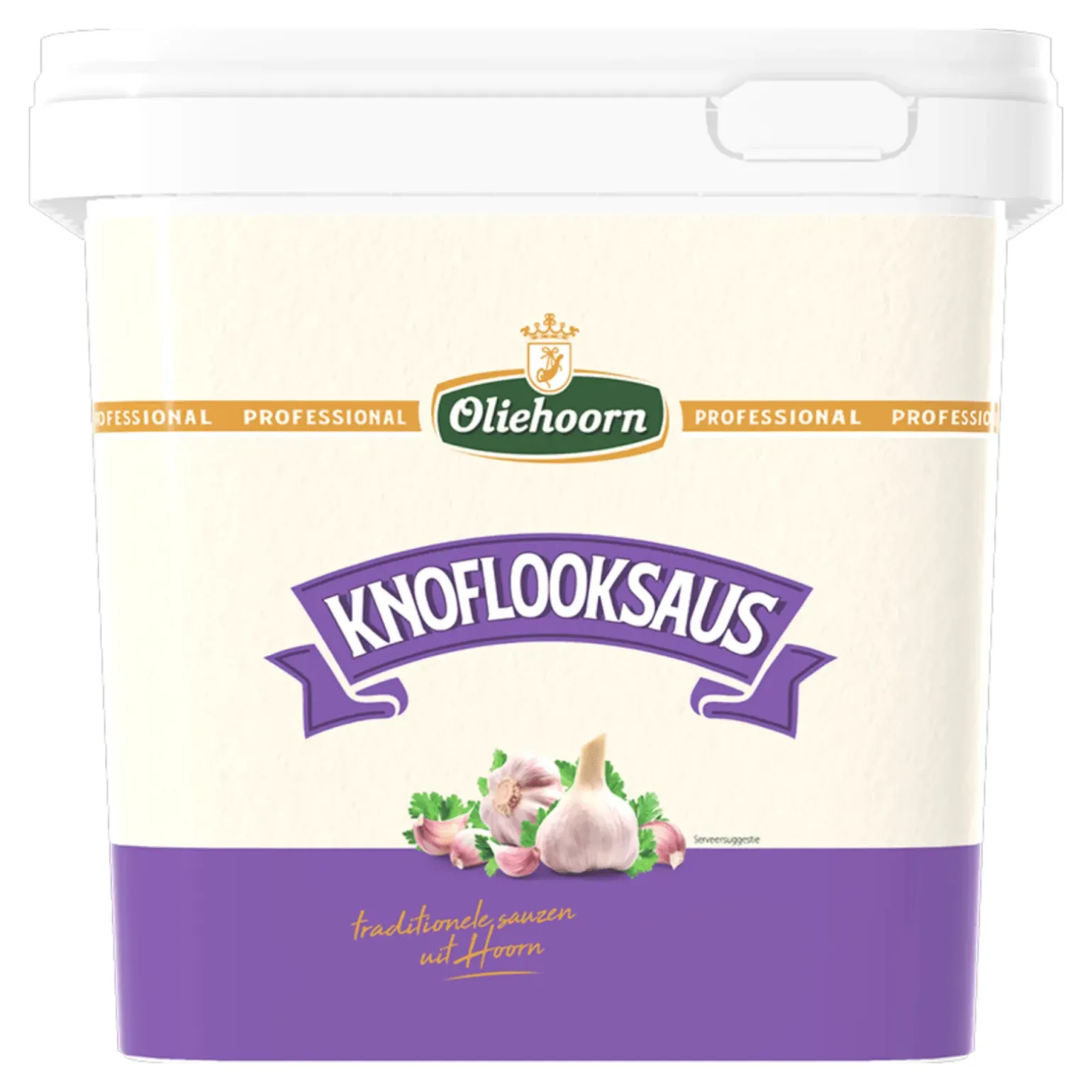 Oliehoorn knoflooksaus is een lekkere smeuïge volle saus, die heerlijk smaakt bij vleesgerechten. De structuur van de knoflooksaus is glad en soepel.