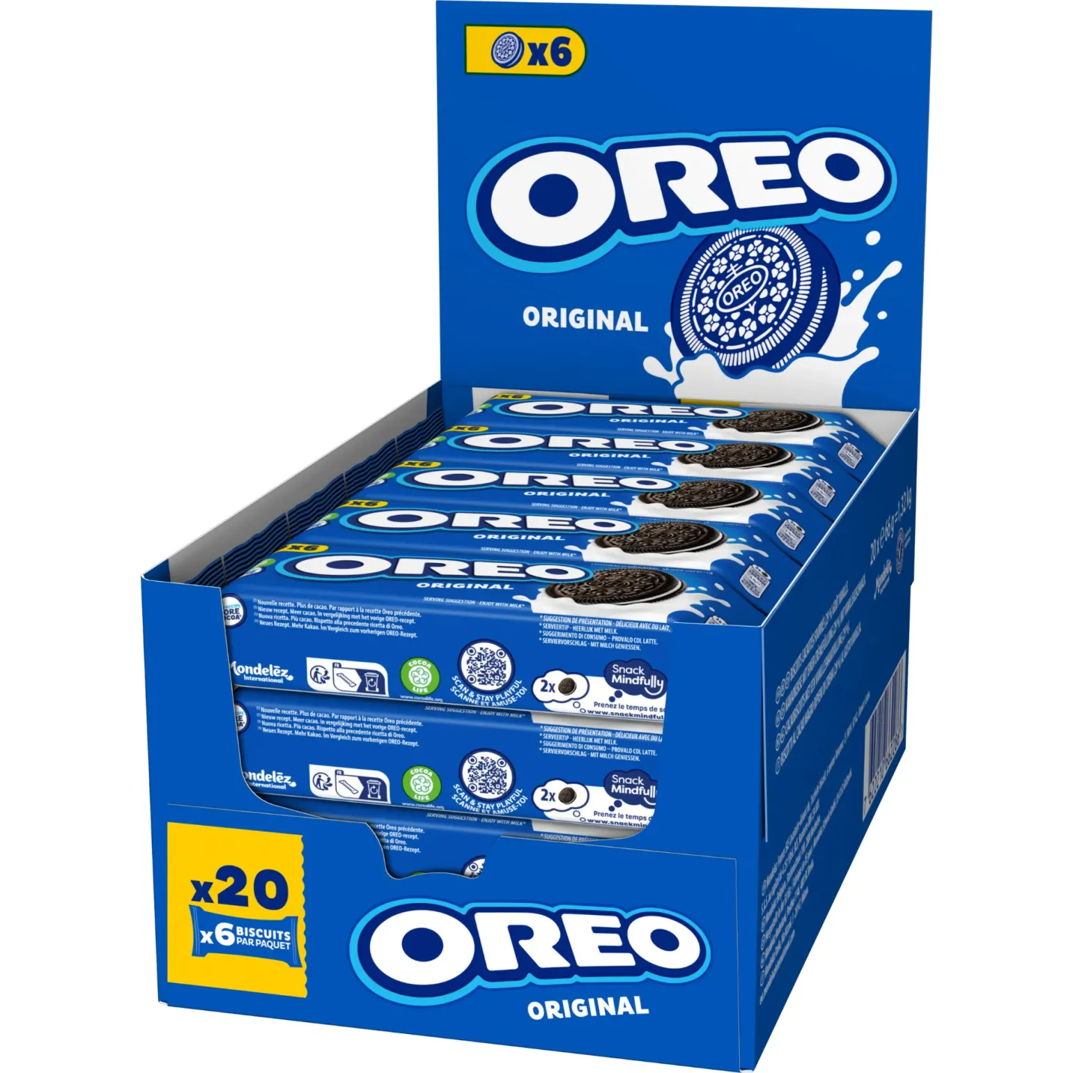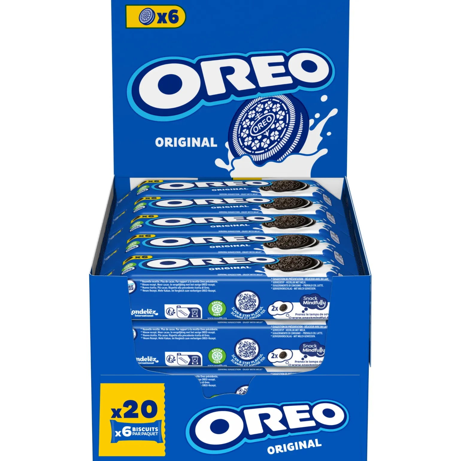De klassieke Oreo’s zijn een soort chocolade koekjessandwiches met een heerlijke vanille crèmelaag in het midden. Geliefd door jong en oud. In een displaydoos zitten 20 pakken à 6 koekjes (66 gram) in een doos. Ideaal om te presenteren op de toonbank in de kantine of op een balie. De handige verpakking leent zich ervoor om mee te nemen onderweg en te delen met vrienden, familie of collega’s. Bestel eenvoudig en voordelig je op Compliment.nl. Let op! maximale houdbaarheid 6-8 weken vanaf leverdatum, geen retourname.