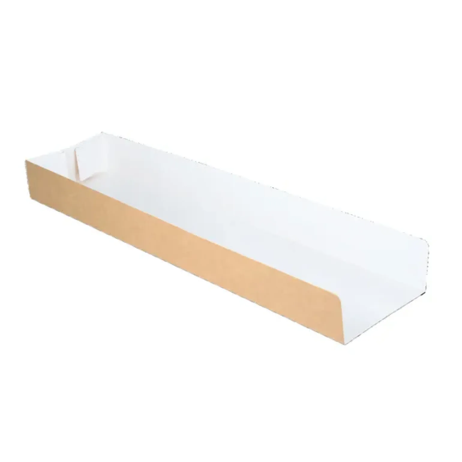 Serveer je snacks en ben je nog opzoek naar een bakje met een neutrale uitstraling? Dan is dit 100% biologisch afbreekbare inschuif bakje van kraft/wit karton een goeie optie. Het inschuif karton is 28 bij 7 bij 3 cm groot en daarom ideaal voor het serveren van grote porties poffertjes, paninis of andere belegde broodjes.