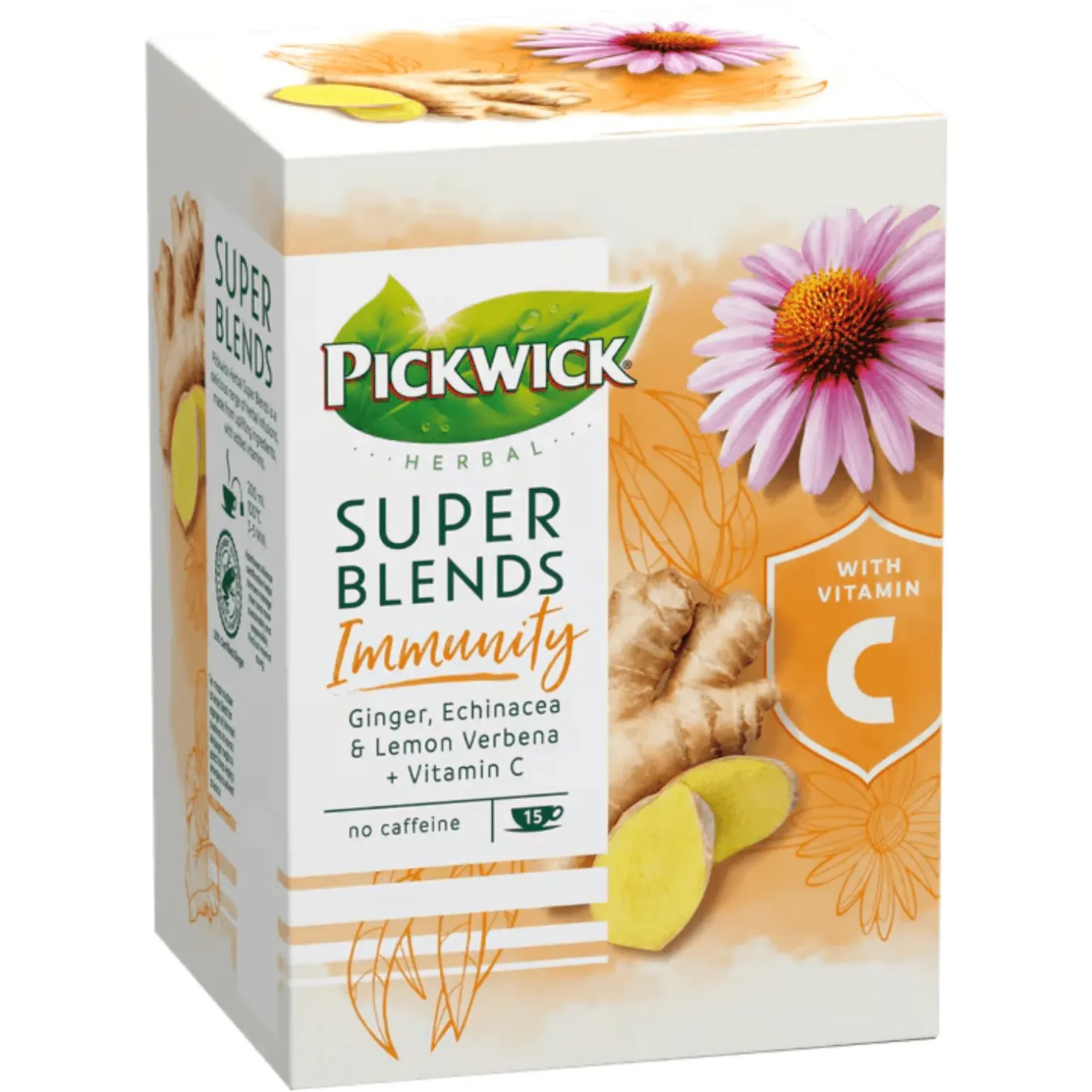 Versterk je weerstand op een natuurlijke manier met Pickwick Super Blends Immunity. Deze kruidenthee combineert zorgvuldig geselecteerde ingrediënten zoals gember, echinacea en vitamine C, die je immuunsysteem ondersteunen. Perfect voor dagelijks gebruik, vooral in koude seizoenen of tijdens drukke periodes waarin je wel wat extra weerstand kunt gebruiken.