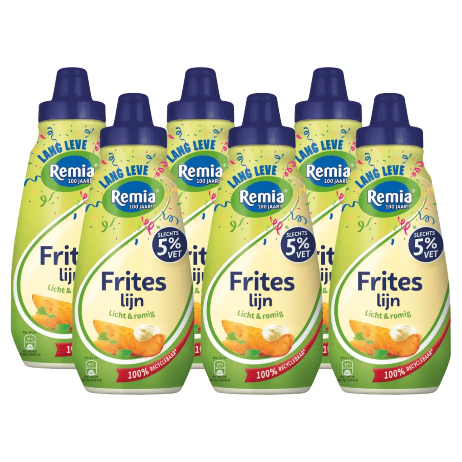 Remia Friteslijn is een romige fritessaus met slechts 5 % vet, ontwikkeld voor liefhebbers van smaak met minder calorieën. Verpakt in een handige knijptube met doseerdop, ideaal voor frites, snacks of salades. De tubes worden per 6 stuks verkocht.