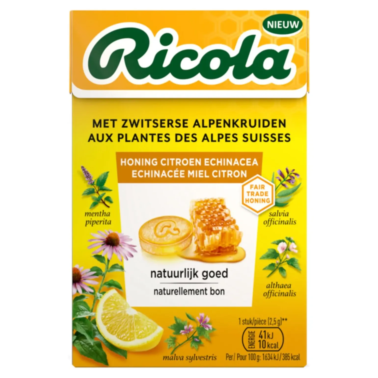 Ingrediënten: Suiker, glucosestroop, honing, citroensapconcentraat, kruidenextract (0,7%) uit de 13-kruidenmix van Ricola, echinacea-extract, natuurlijk aroma’s, menthol, kleurstof (bètacaroteen).