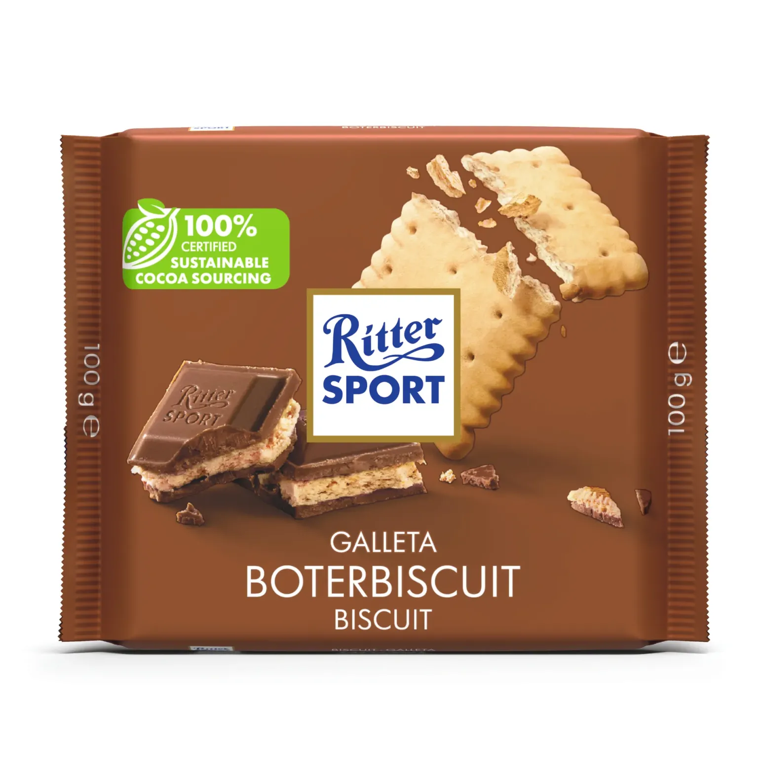De Ritter Sport Boterbiscuit biedt een unieke combinatie van texturen door een volledig vierkant boterbiscuitje te integreren in een bedje van fijne cacaocrème en romige melkchocolade. Het koekje wordt met een extra portie boter gebakken, wat resulteert in een opvallend krokante beet die perfect contrasteert met de zachte chocoladelaag. Dankzij het compacte formaat van 100 gram per reep is dit product uitermate geschikt voor de voorraadkast of als een kwalitatieve traktatie bij de koffie.