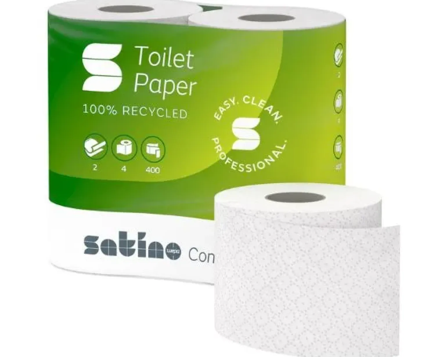 Satino toiletpapier recycled 2 laags 400 vel 40 rollen is 100% gerecycled. De toiletpapier rollen van Satino zorgt voor luxe, comfort en hygiëne. De witte toiletpapier rollen zijn gemaakt van sterk en zacht gerecycled papier. De toiletrollen bevatten ieder 400 vellen 2-laags papier. In de verpakking zitten 4 rollen. In totaal 10 verpakkingen à 4 rollen per pak, dus in totaal 40 rollen. Wacht je op een scherpe wc papier aanbieding? Niet nodig: bij online groothandel Compliment.nl koop je altijd voordelig de Satino recycled 2 laags toiletpapier wc papier. Gemaakt van hoogwaardige cellulose. Satino prestige supersoft wc papier is helder wit van kleur en erg zacht. Satino recycled 2 laags toiletpapier is sterk absorberend. Neem ook een kijkje in ons uitgebreide assortiment.