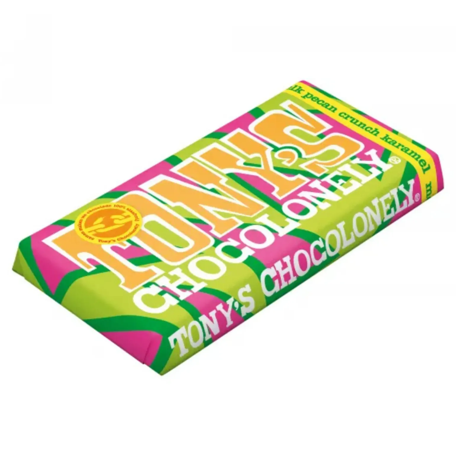 Niet alleen het printje op de verpakking valt op, maar ook de smaak van de Tony’s Melk Pecan Crunch Karamel. Deze crunchy reep wil je niet missen! Romige melkchocolade, stukjes karamel, pecannootjes, en crunch. Hij is helemaal terug van weggeweest. Je kunt deze reep perfect combineren met een kopje koffie, maar ook heerlijk als tussendoortje of om cadeau te geven aan iemand die je deze hemelse combinatie gunt. Bij groothandel Compliment.nl koop je voordelig Tony’s Melk Pecan Crunch Karamel (15x 180gr). De afmeting van een reep is 8cm x 16cm. Probeer ook eens de andere hemelse combinaties, zoals de of .