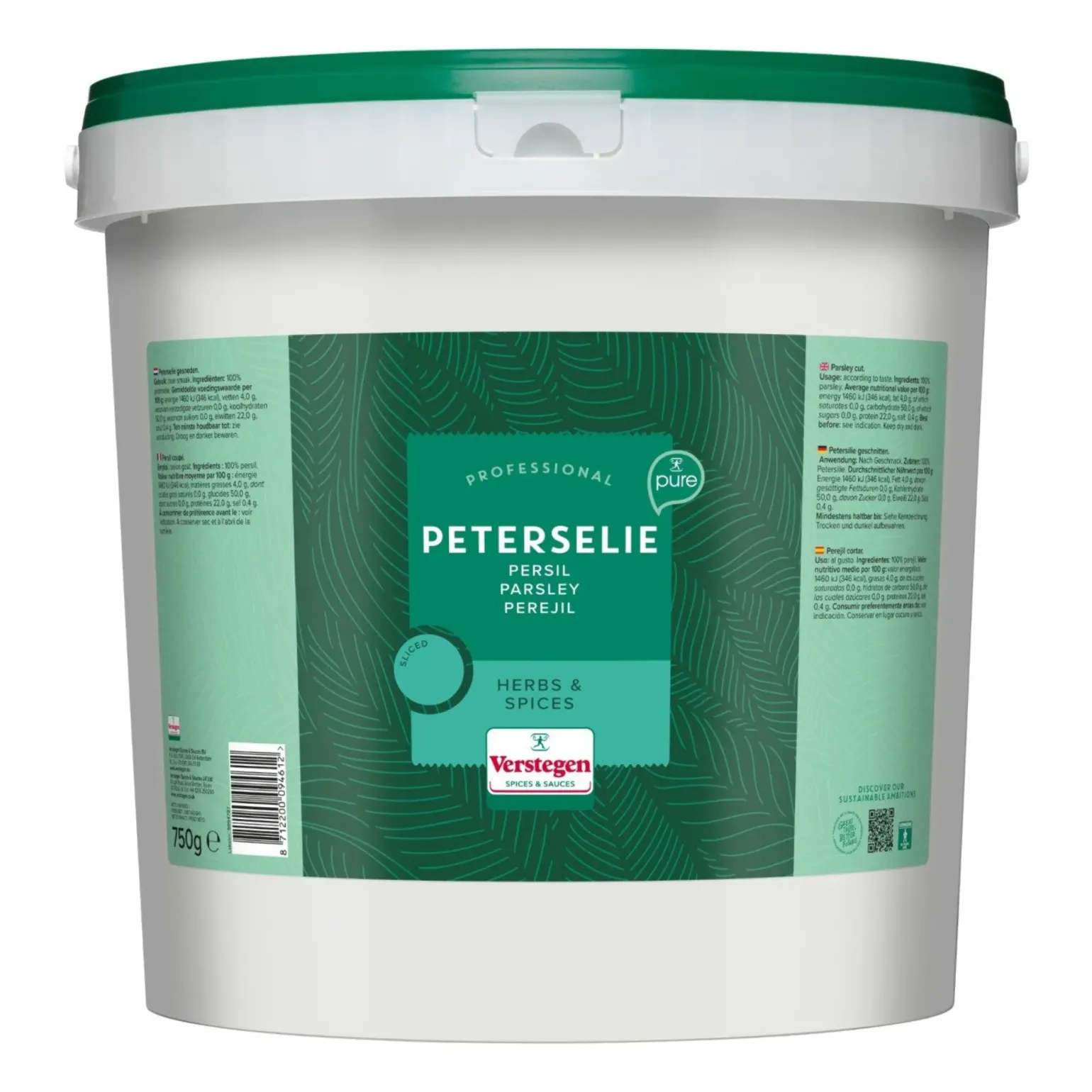 Gesneden peterseliebladeren zijn donkergroen van kleur en hebben een verfijnd aroma. Het product heeft een verfijnde hartige smaak, maar de smaak is niet overheersend. Om de smaak van peterselie goed te behouden is het het beste om de peterselie na de bereiding toe te voegen aan je gerecht. Peterselie gebruik je bijvoorbeeld in sausen, dressings, salade, kruidenboter of als garnering. Er zit 750 gram in een emmer, ideaal voor de grootverbruiker zoals de horeca dus.