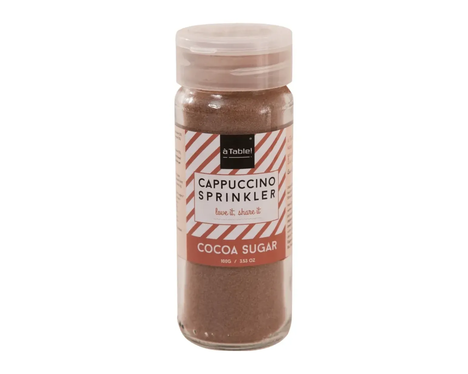Een stijlvolle strooier met een fijne mix van kristalsuiker en cacaopoeder (95 % suiker, 5 % cacao). Deze topping is ideaal om cappuccino’s, latte macchiato’s, desserts, pannenkoeken of ijs een feestelijke finishing touch te geven. Met de handige doseerdop strooi je precies en moeiteloos, zonder rommel.