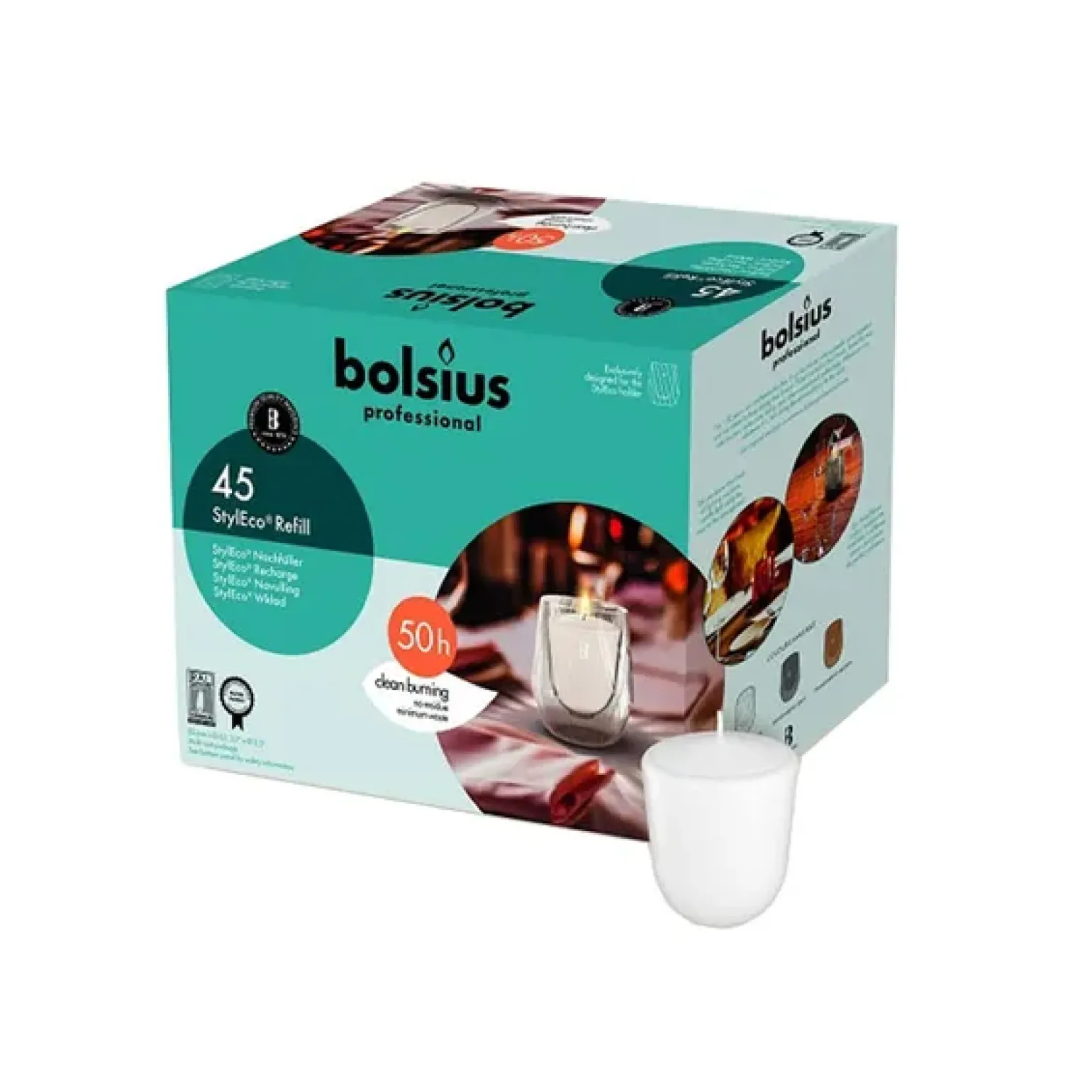Bolsius Professional StylEco ® navullingen 50 branduren Wit doos 45 stuks Stijl, gemak en duurzaamheid komen samen in het nieuwe refill-tafelkaarsconcept StylEco® van Bolsius Professional. Dit is het eerste navulconcept voor tafelkaarsen waarbij denavulling volledig opbrandt zonder afval of residu. Deze sfeervolle kaars in een stijlvolle glazen houder brandt bovendien 50 uren, is gemaakt van duurzame grondstoffen en makkelijk verwisselbaar.