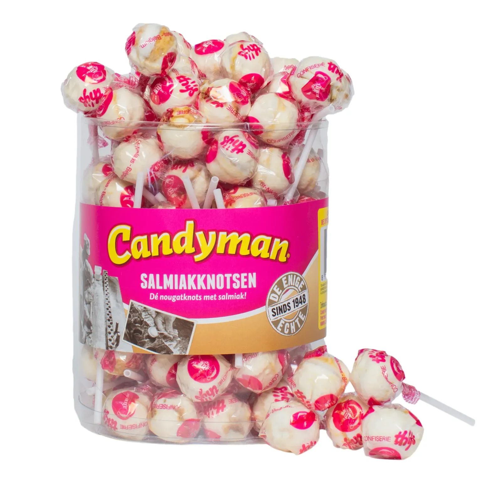 De lekkerste lolly die er is! Candyman Salmiakknotsen zijn gemaakt van zoete nougat en salmiakpoeder. De salmiak knotsen zijn een combinatie van zoete nougat en zoute salmiak, die zorgen voor een unieke smaaksensatie. Sommige dingen zijn gewoon goed, zoals deze salmiak knotsen. Daarom is het recept altijd hetzelfde gebleven: wat goed is moet goed blijven! Candyman salmiak knotsen zijn ideaal voor de verkoop, als traktatie, in een snoepzakje of verrassingszakje, om uit te delen tijdens Halloween of Sint Maarten, of om onderweg altijd iets lekkers bij de hand te hebben. Voordelig salmiaklollies kopen doe je natuurlijk bij online snoepgroothandel Compliment.nl. Candyman salmiakknotsen koop je per silo met 60 per stuk verpakte lollies van 30 gram per stuk. Bekijk ook de rest van ons