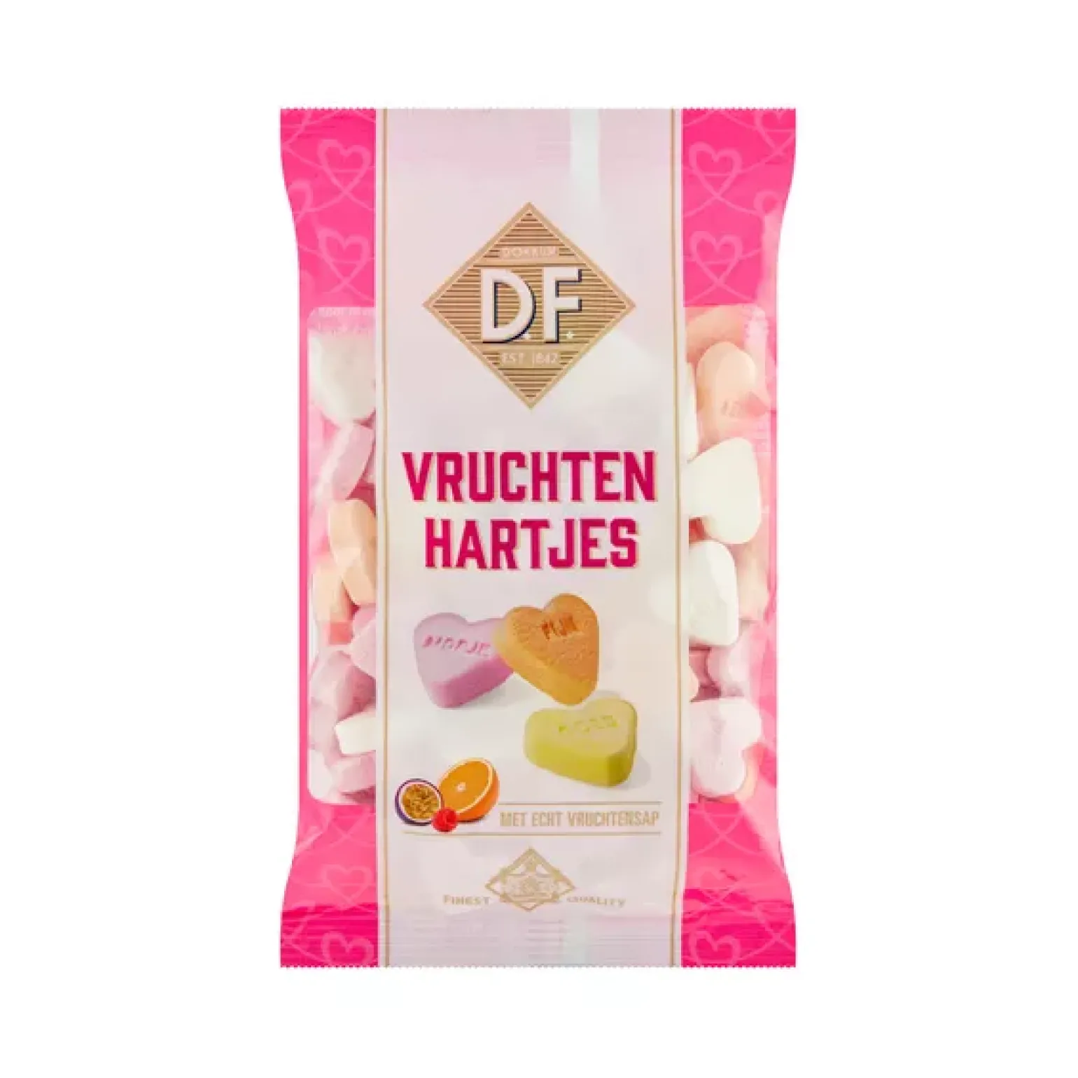 De D.F vruchtenhartjes zijn onmisbaar in het Nederlandse snoepgoed. Jong en oud is opgegroeid met deze overheerlijke vruchtenhartjes. De vruchtenhartjes bestaan uit de smaken: sinaasappel, ananas, passievrucht, papaja, mango, zure kers, framboos, aardbeien, bosbessen en zwarte bessen. Deze snoepjes zijn ideaal om uit te delen, voor in de kantine of voor in de snoeppot. In 1 doos zitten 12 zakjes verpakte D.F. vruchtenhartjes.
