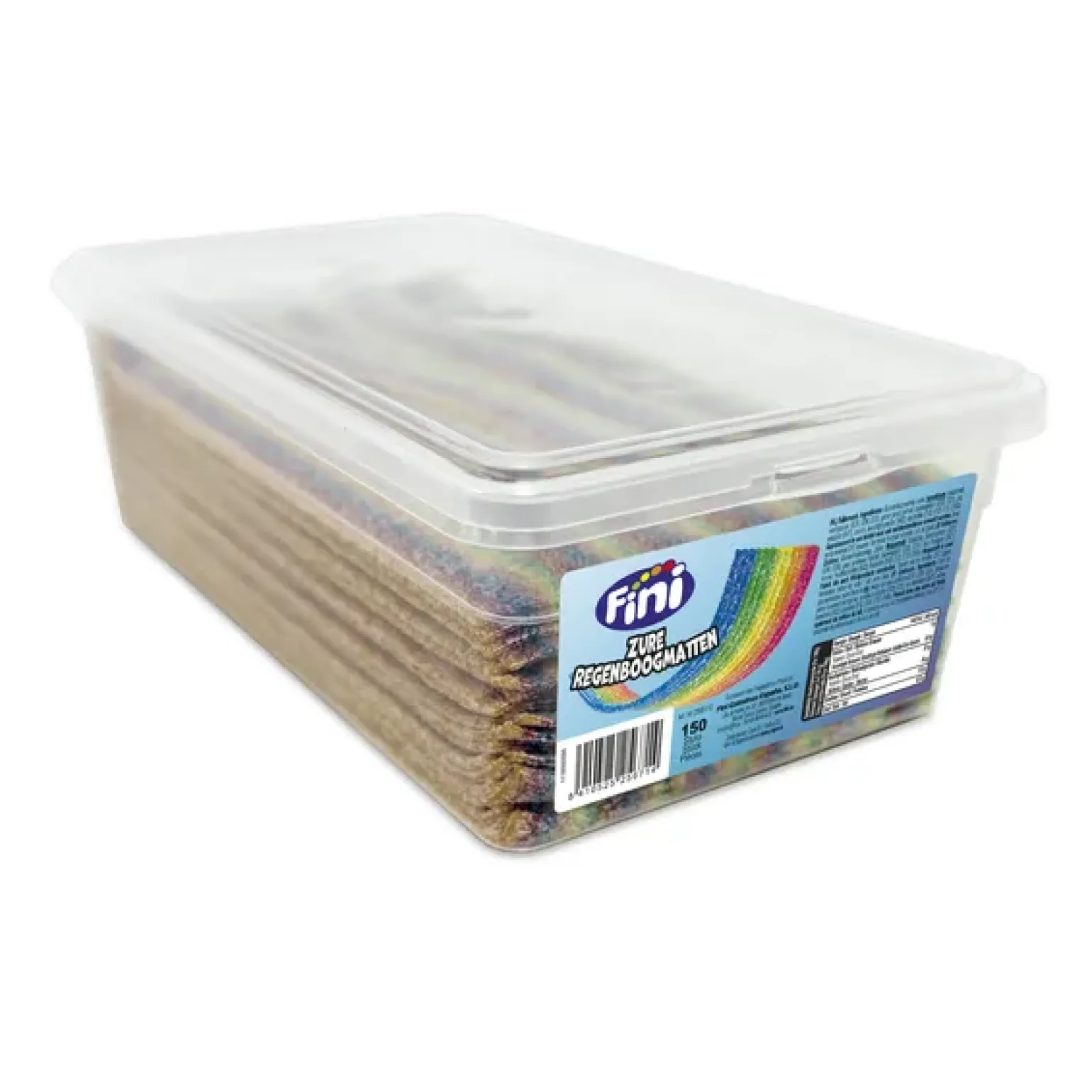 Heerlijke zure matten in alle kleuren van de regenboog. Fini zure regenboogmatten hebben een laagje suiker. Maar vergis je niet: de zoete smaak van het suiker vergeet je snel zodra je toe bent aan het zure. In de handige hersluitbare bak zitten 150 zure matten. Doordat de bak hersluitbaar is blijven de matten lekker zacht en vol van smaak. De bak heeft een afmetng van 81 x 142 x 236 (l x h x b in mm).