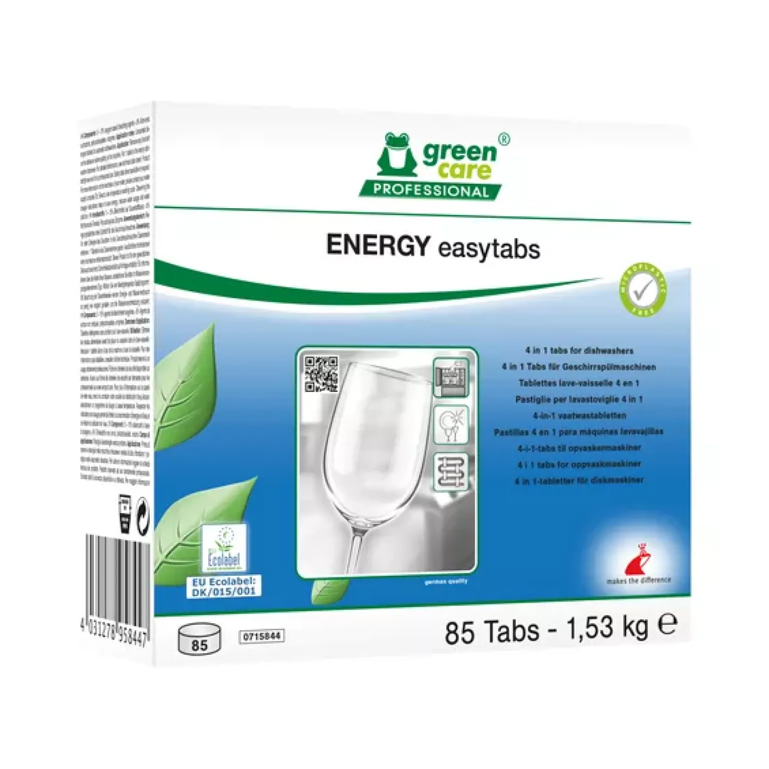 Green care energy easytabs zijn 4 in 1 vaatwastabletten. Deze biologische vaatwastabletten verwijderen vlekken en vet en maken natuurlijk de vaat stralend schoon. De samenstelling van de vaatwastabletten versnelt de droogtijd, verhindert kalkaanslag. en voorkomt het vormen van een witte sluier. Energy easytabs zijn samengesteld uit hernieuwbare bronnen. Bovendien is dit vaatwasmiddel fosfaatvrij en geurvrij en vrij van eco-toxische bestanddelen. Kortom: dit is de beste keuze wanneer je duurzaamheid, milieu en een verantwoorde keuze belangrijk vindt.