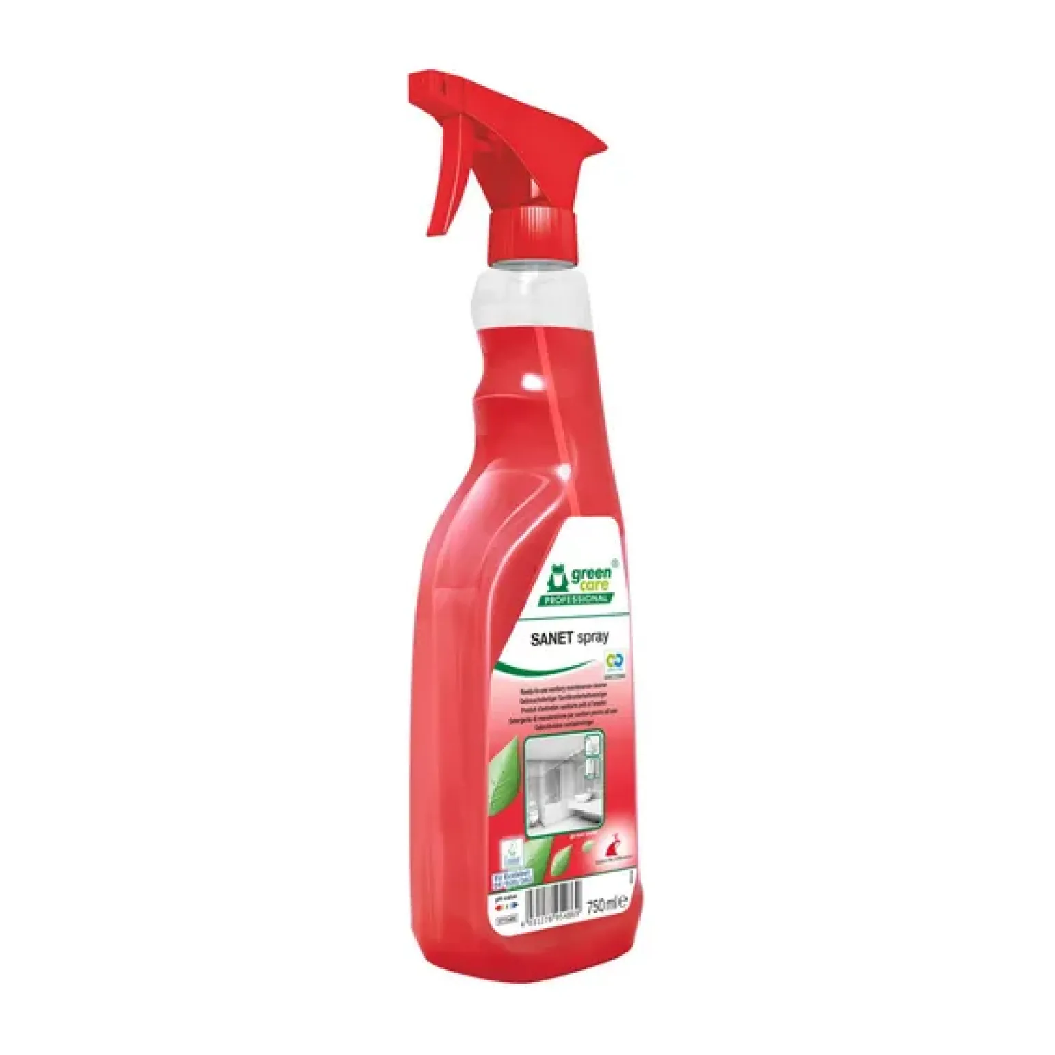 Green Care SANET spray krachtige, milieuvriendelijke sanitairreiniger Nieuwe formule voor effectieve verwijdering van kalk, vet en cosmeticaresten in sanitaire ruimtes. Gebruiksklaar, tijdbesparend en materiaalvriendelijk. Laat een frisse, langdurige geur achter. Gemaakt van hernieuwbare grondstoffen en verpakt in 100% gerecycled plastic. Veilig toepasbaar in badkamers van hotels, kantoren en openbare ruimtes.