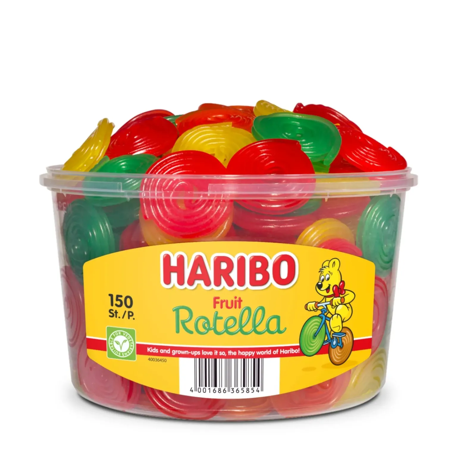 De Haribo rotella fruit is het snoepje waar jij van gaat jojo-en! Deze vrolijke jojo is een variant op de bekende Haribo rotella drop. De Haribo rotella fruit geeft jou een speciale en zoete ervaring die jij niet wilt missen. Deze snoepjes zijn ideaal voor in de kantine of om uit te delen aan je vrienden of familie. In 1 silo zitten 150 stuks Haribo rotella fruit.