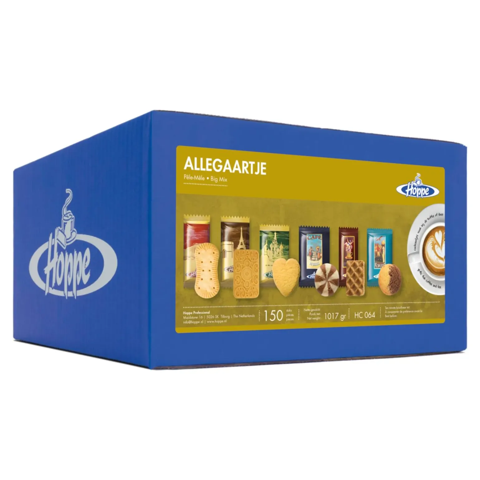 In deze doos van Hoppe zitten zes verschillende soorten koekjes. Dit zijn de populairste koekjes van Hoppe. De doos bevat: Pain d’amande, twister, allerhande, koffiewafeltje, marmerkoekje, kattentong. Met een doos Hoppe allegaartje kan je eindeloos variëren. De koekjes zijn per stuk verpakt en serveer je aan jouw gasten bij ene kopje koffie, thee, cappuccino of espresso. Op de folies staan afbeeldingen van steden als Amsterdam, Parijs, Sydney en New York. Doordat de koekjes per stuk verpakt zijn blijven ze lekker knapperig. Geef jouw klanten en gasten een warm welkom door deze heerlijke koekjes te presenteren bij jouw koffiehoek, in de showroom of wachtruimte. Hoppe allegaartje koop je per doos met 150 per stuk verpakte koekjes. Bekijk ook de rest van onze op Compliment.nl.