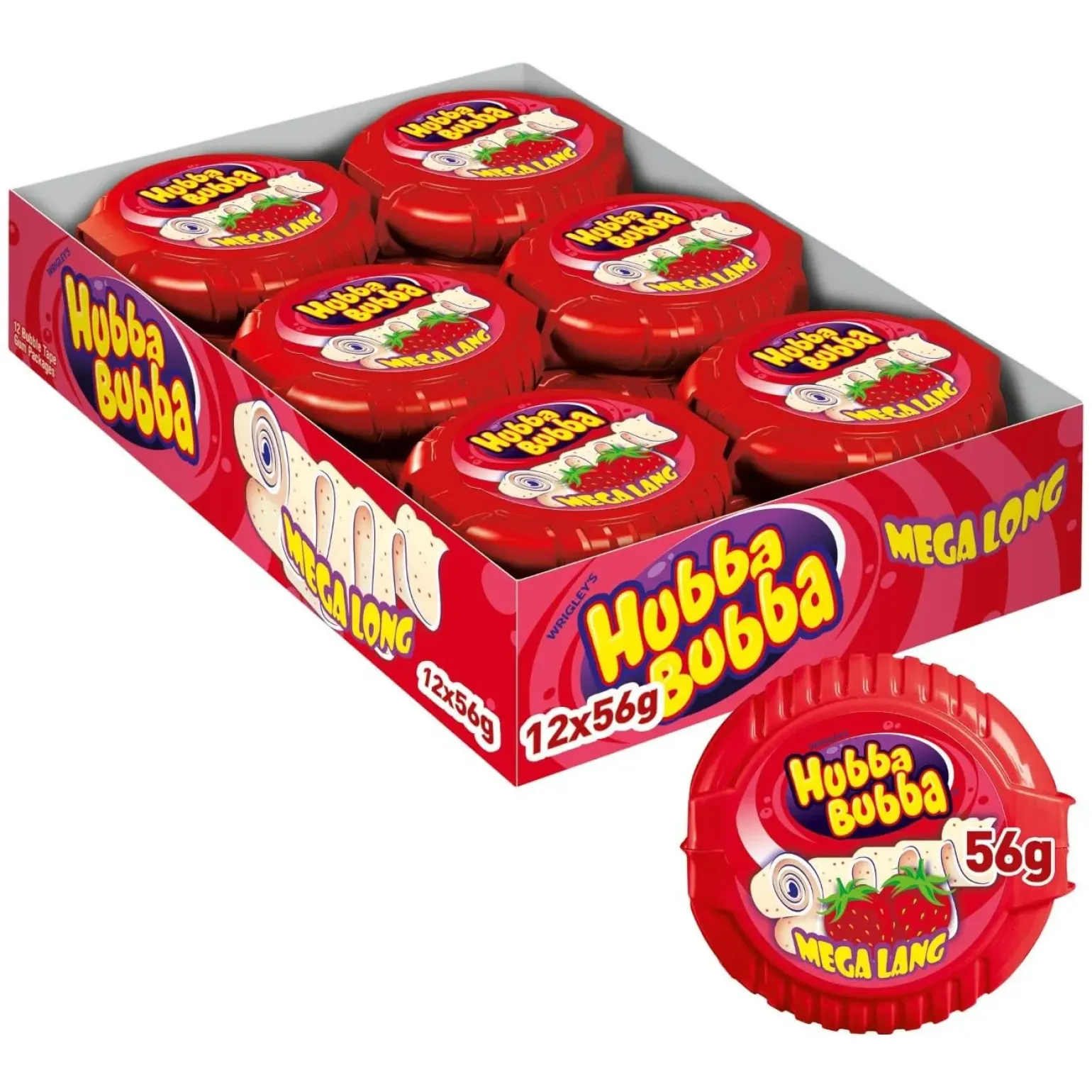 Bij Compliment.nl koop je voordelig Hubba Bubba Tape Strawberry (12x 56g), de mega lange bubbelgumrol die garant staat voor eindeloos kauw- en blaasplezier. Met de frisse en fruitige aardbeiensmaak geniet je bij elke hap van een zoete traktatie die niet alleen lekker is, maar ook perfect om gigantische bubbels mee te blazen. De zachte kauwstructuur maakt het gemakkelijk om steeds opnieuw indrukwekkende bubbels te creëren. Dankzij de handige rolverpakking scheur je precies de lengte af die je wilt, ideaal om te delen met vrienden of om helemaal zelf op te kauwen. Met maar liefst 12 rollen van 56 g heb je altijd genoeg voorraad voor feestjes, traktaties of gewoon voor een speels moment tussendoor.