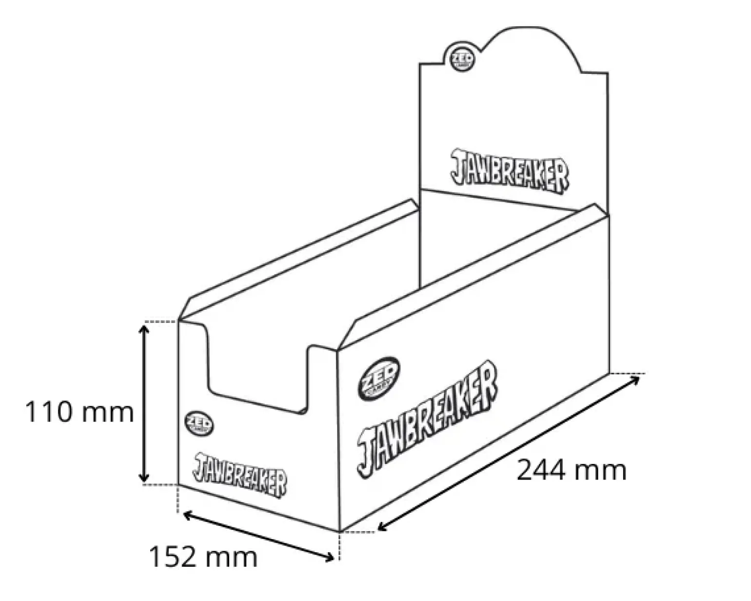 De echte jawbreaker met de smaak van zwarte bessen. Door deze toevoeging is de jawbreaker onweerstaanbaarder dan ooit tevoren. De harde snoepballen zorgen voor een wervelwind aan smaken in je mond. In de fraaie displaydoos (mooi op de balie, achter de bar of in de kantine) zitten 40 verpakkingen met 4 ballen.