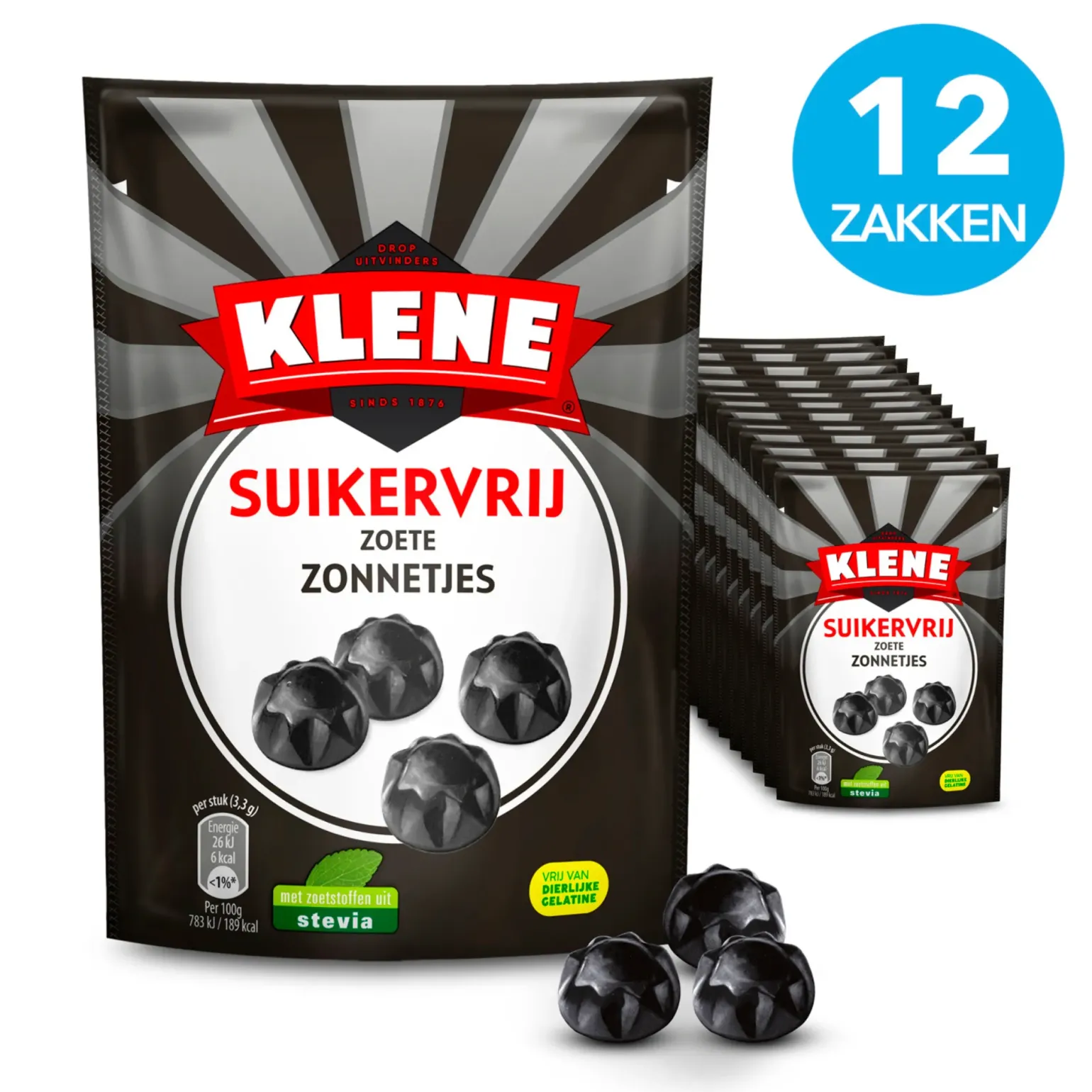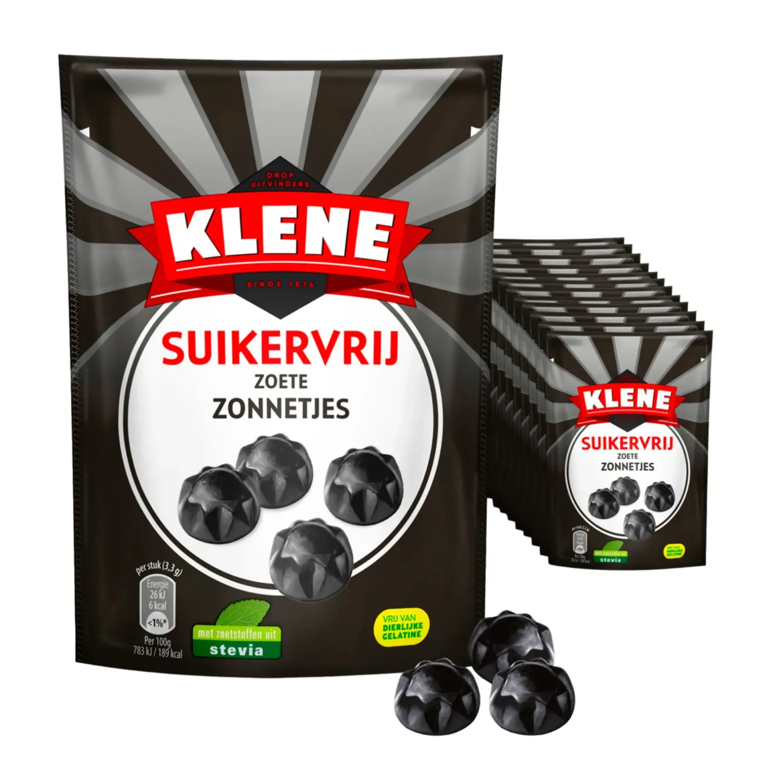 Klene suikervrije zoete zonnetjes zijn volzoete dropjes in de vorm van een zonnetje. Deze suikervrije dropjes van Klene worden gemaakt volgens authentiek familierecept. Gemaakt zonder dierlijke gelatine en suiker. De stevige dropjes zitten in een handig hersluitbaar zakje. Ideaal dus om mee te nemen onderweg in de auto, op kantoor of gewoon thuis in de snoepkast. De zakjes Klene drop zijn ook heel goed te gebruiken voor de verkoop in jouw kantine, snoepautomaat of vendingmachine. Voordelig zoete Klene dropjes kopen doe je natuurlijk bij online snoepgroothandel Compliment.nl. Je koopt Klene suikervrije zoete zonnetjes per doos met 12 zakjes van 110 gram (+/- 33 dropjes per zakje).