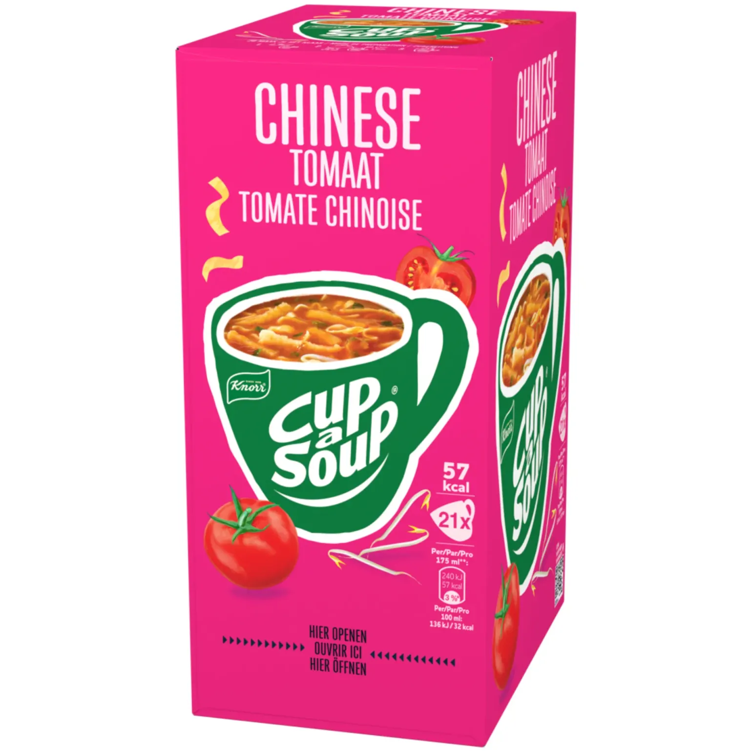 Knorr Cup-a-Soup Chinese Tomaat (21 x 175ml), dé ideale snelle, hartige snack voor op het werk of thuis. Deze smaakvolle tomatensoep met een subtiele oosterse twist combineert de friszoete smaak van duurzaam geteelde tomaten met heerlijke specerijen zoals koriander, kruidnagel en cayennepeper. Perfect als tussendoortje op een drukke dag of als lichte maaltijdvervanger. Deze soep bevat geen kunstmatige kleurstoffen, conserveermiddelen of toegevoegde smaakversterkers, puur genieten van natuurlijke ingrediënten. Met 21 zakjes in één verpakking heb je altijd een snelle, lekkere soep binnen handbereik.