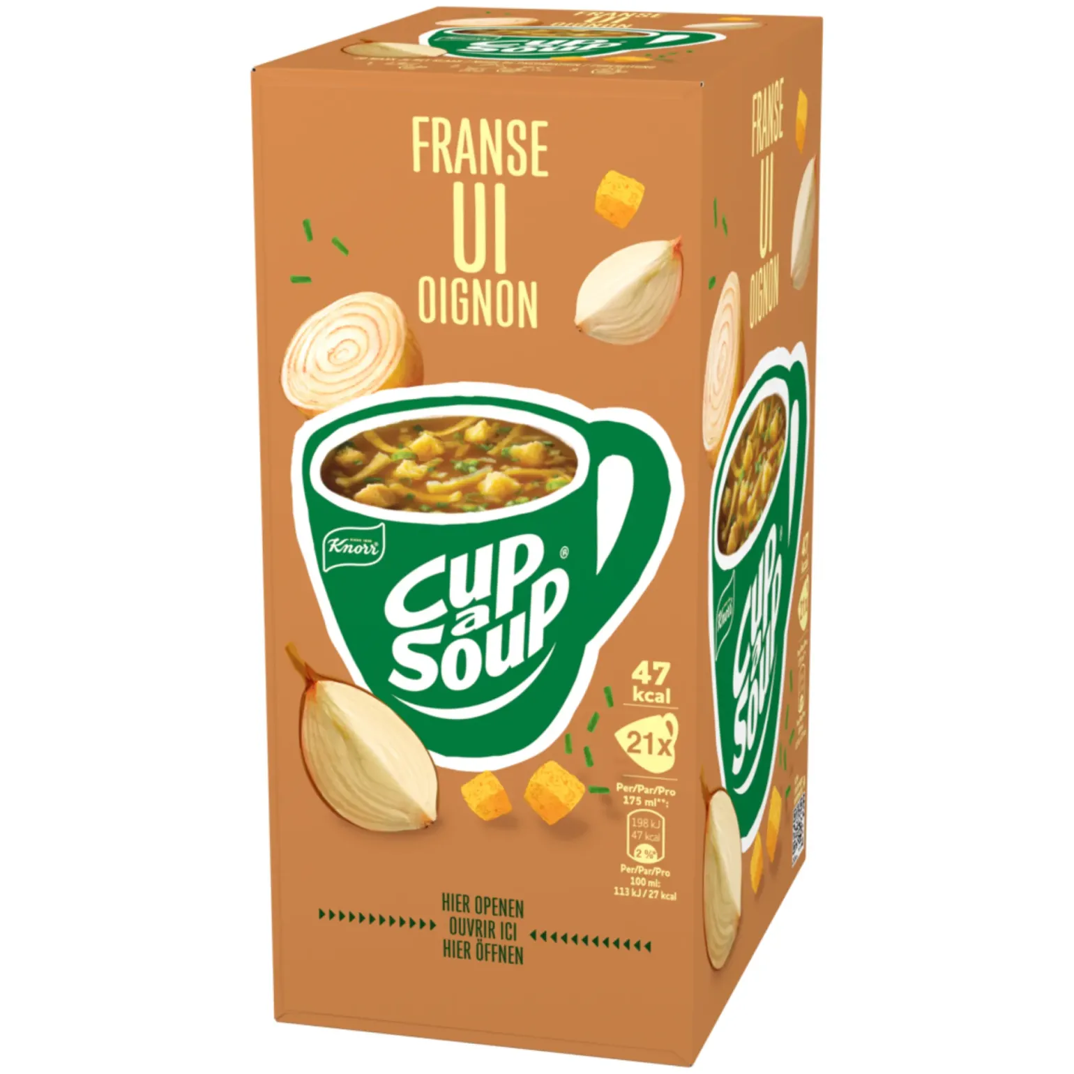 Knorr Cup-a-Soup Franse Ui is een hartige instant moksoep met de karakteristieke smaak van klassieke Franse uiensoep. De soep combineert ui met knapperige croutons en pannenkoekreepjes voor extra structuur en een volle smaak. Ideaal als warm tussendoortje tijdens een drukke werkdag, op kantoor of thuis. Met de handige portiezakjes maak je in een minuut een mok soep: voeg simpelweg 175 ml kokend water toe en roer even door. De doos bevat 21 zakjes en is daardoor geschikt voor kantines, werkplekken of thuisgebruik.