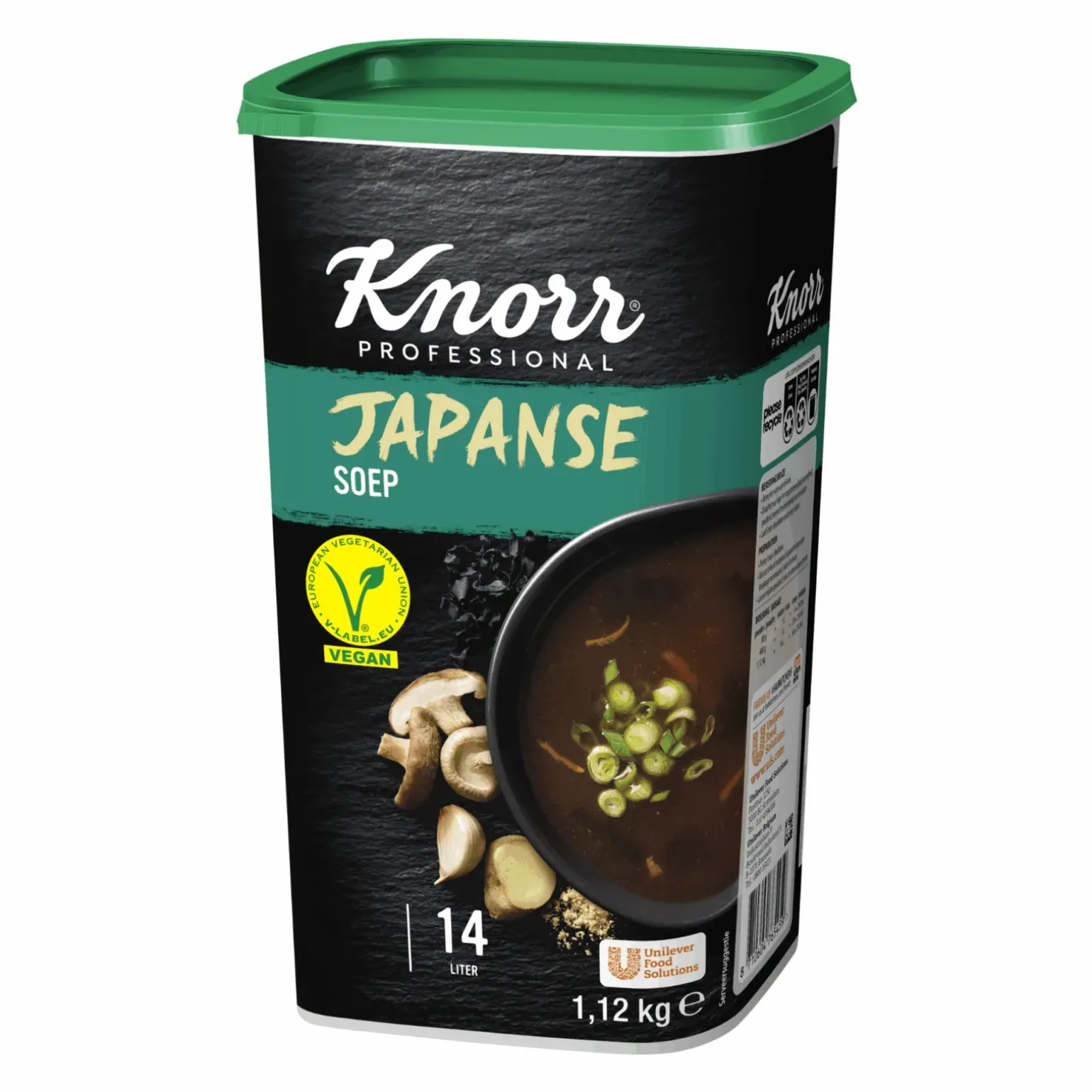 Knorr Professional Japanse Soep is een basissoep met de smaak van een ziltige bouillon. Het poeder is een goede basis voor een lekkere soep en biedt ruimte voor eigen creativiteit. Deze veganistische soep is vrij van smaakversterkers, conserveermiddelen en kunstmatige kleurstoffen. Het product kan aangelengd worden tot 14 liter soep en is diepvries en au bain-marie stabiel. Het Knorr Professional-assortiment biedt een brede range aan klassieke én wereldse soepen.