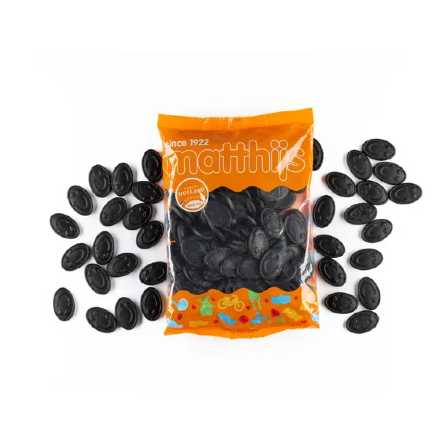 Zachte en zoete drop in een ronde vorm. Op de drop staat een smiley gezicht.