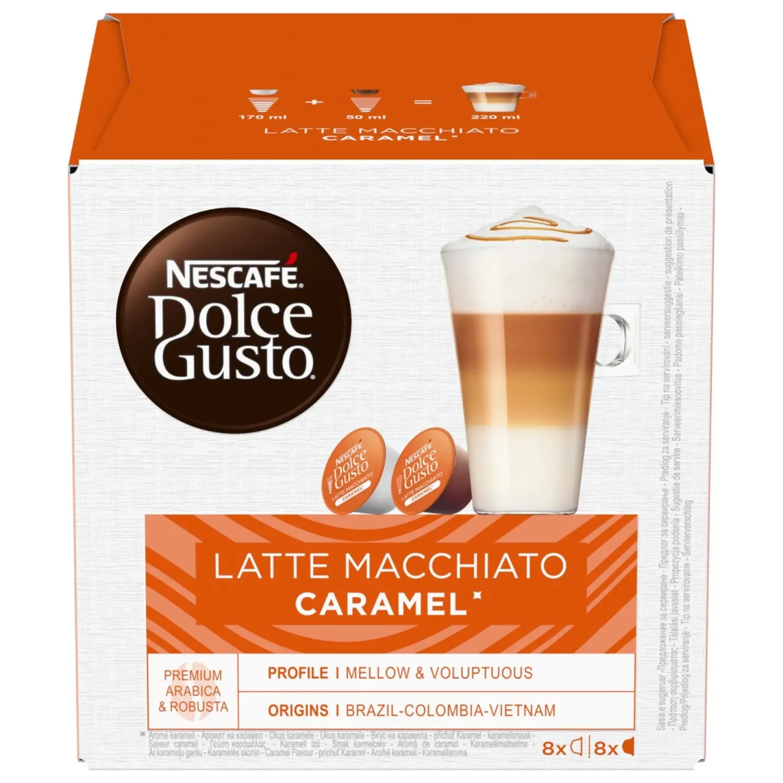 De Nescafe Dolce Gusto Caramel Macchiato is een heerlijke koffie met een rijke smaak en een romige textuur. Deze smaakvolle koffie is verpakt in handige Dolce Gusto cups die speciaal zijn ontworpen voor gebruik in Dolce Gusto koffieapparaten.