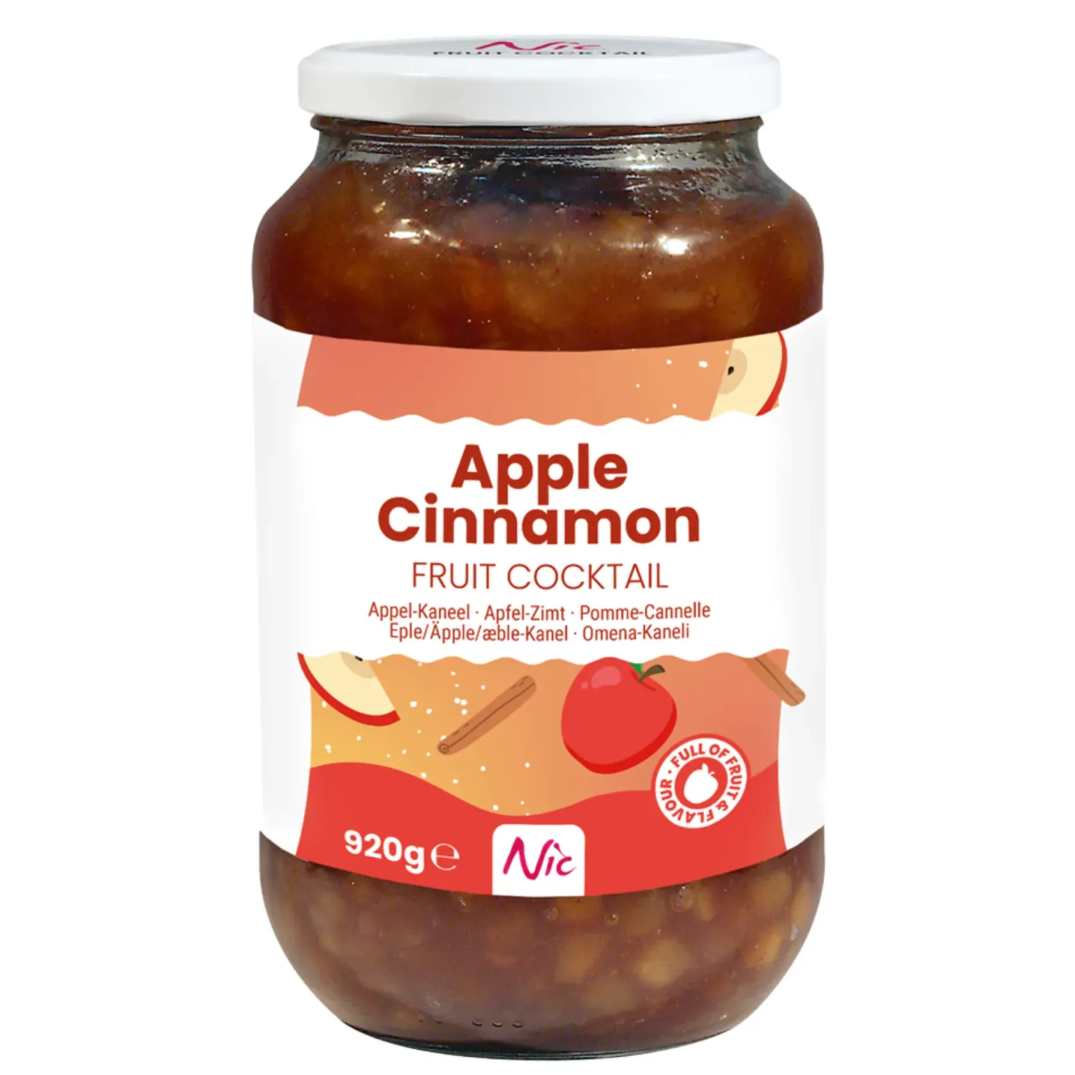De Nic Appel Kaneel Fruitcocktail pot 920 gram is een heerlijke combinatie van fruitige appelstukjes en warme kaneelsmaak in een rijke siroop. Perfect om softijs, desserts, pancakes of yoghurt een lekkere twist te geven met seizoenssmaak. De fruitcocktail bevat een hoog aandeel appel en rozijnen waardoor elke lepel vol smaak zit. Je kunt ‘m zowel koud als warm serveren, ideaal voor horeca én thuisgebruik.