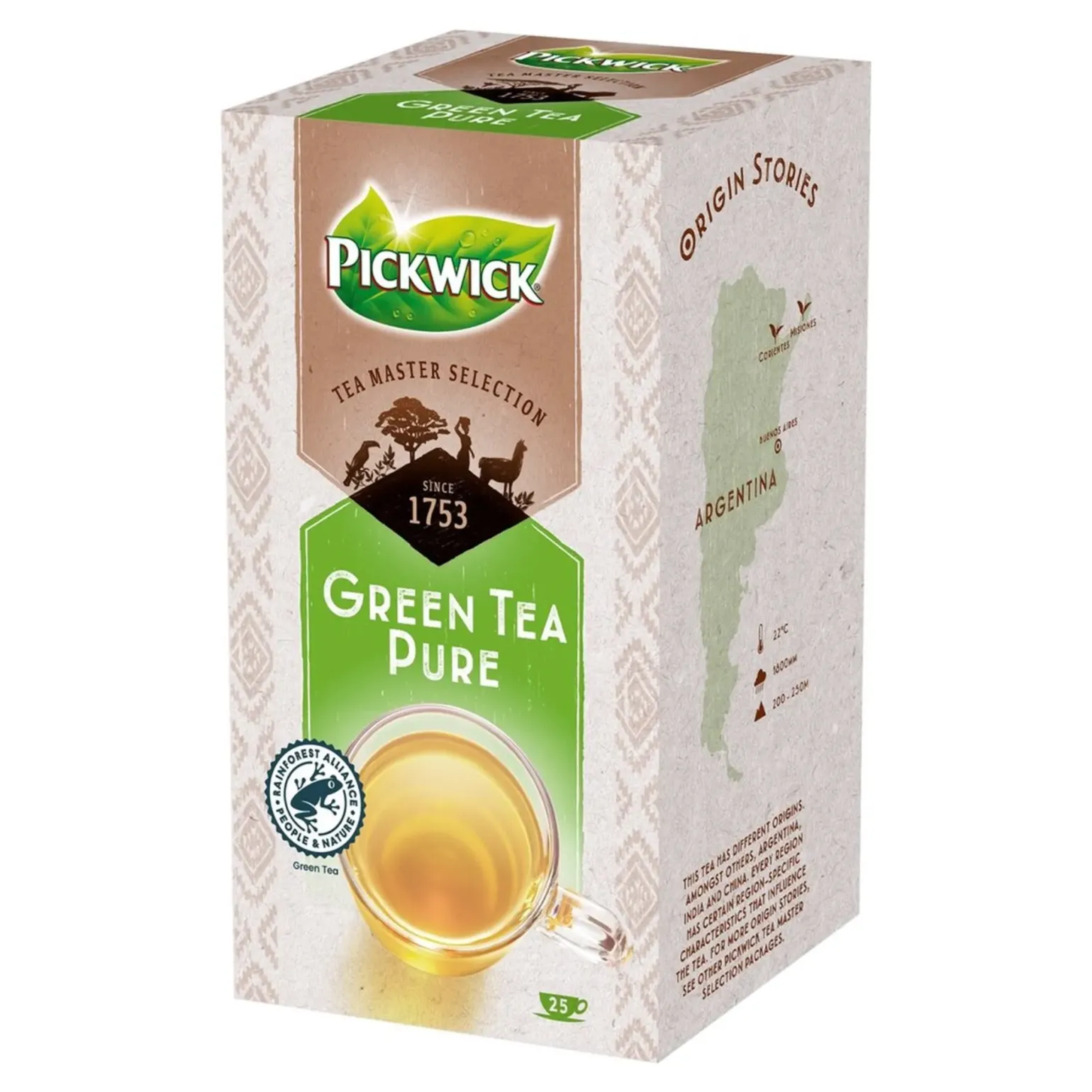 Pickwick master selection green tea pure is een prachtige melange van frisse groene theeblaadjes, speciaal geselecteerd voor de zachte en verfijnde natuurlijke smaak van puur groene thee. De thee is afkomstig uit Argentinië, en draagt ook een vleugje mee uit India en China. De thee is ook erg geliefd bij het ontbijt. De Tea Master Selection van Pickwick heeft extra grote theeblaadjes. Hierdoor trekt de thee langzaam en komt de smaak gedoseerd vrij, en dat proef je!