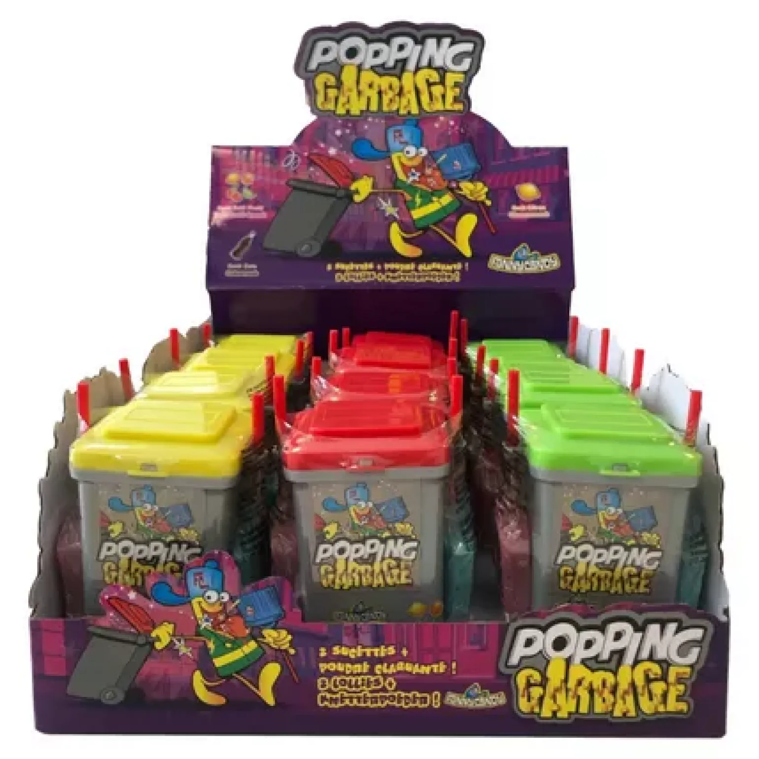 Popping Garbage 40 gram is speels impuls snoep. Dit kindersnoep wordt geleverd in een mini-vuilnisbakje gevuld met knetterend snoeppoeder dat bruist en knispert op de tong. Met de meegeleverde lollys (vormgegeven als bezem en schep) kan het snoeppoeder worden gedipt voor een extra leuke eetervaring. Het snoep combineert zoete en lichtzure smaken zoals cola, citroen en fruitmix en bestaat onder andere uit suiker, dextrose en voedingszuren zoals citroenzuur en appelzuur. Dankzij de originele verpakking en interactieve manier van eten is dit product populair als impuls snoep in kiosken, kantines, snackbars en recreatie verkoop. De verpakking van 40 gram is compact, opvallend en geschikt voor losse verkoop of presentatie in een toonbankdisplay.