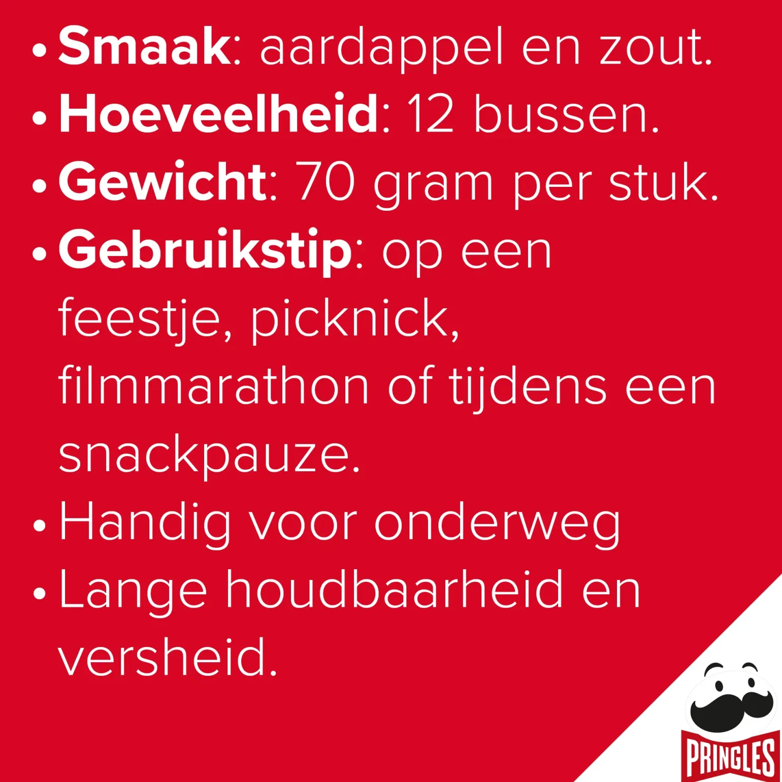 De Pringles Original is een echte klassieker. Een knapperig aardappelchipje met de juiste hoeveelheid zout, verpakt in de iconische, stapelbare chipsvorm die Pringles beroemd heeft gemaakt. Of het nu gaat om een feestje, een picknick, een filmmarathon of een snackpauze op kantoor, Pringles Original zijn altijd een hit en bovendien vegetarisch! De buisvormige verpakking van de zorgt ervoor dat de chips niet stuk gaat in je tas, langer vers blijft en makkelijk is om te sluiten. Deze mediumvariant is een stuk kleiner, waardoor hij ideaal is voor onderweg. Op Compliment.nl bestel je nu eenvoudig en voordelig een doos Pringles Original met 12 busjes à 70 gram. Bekijk ook ons uitgebreide en voordelige assortiment voor nog meer lekkers!