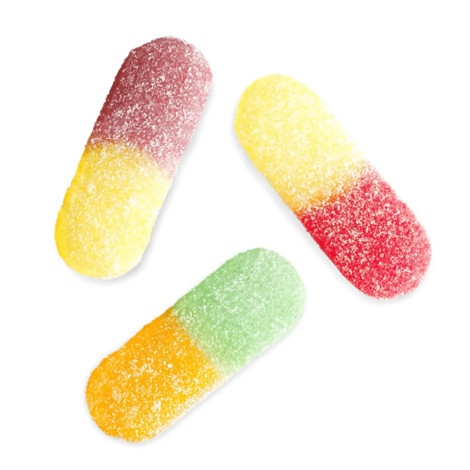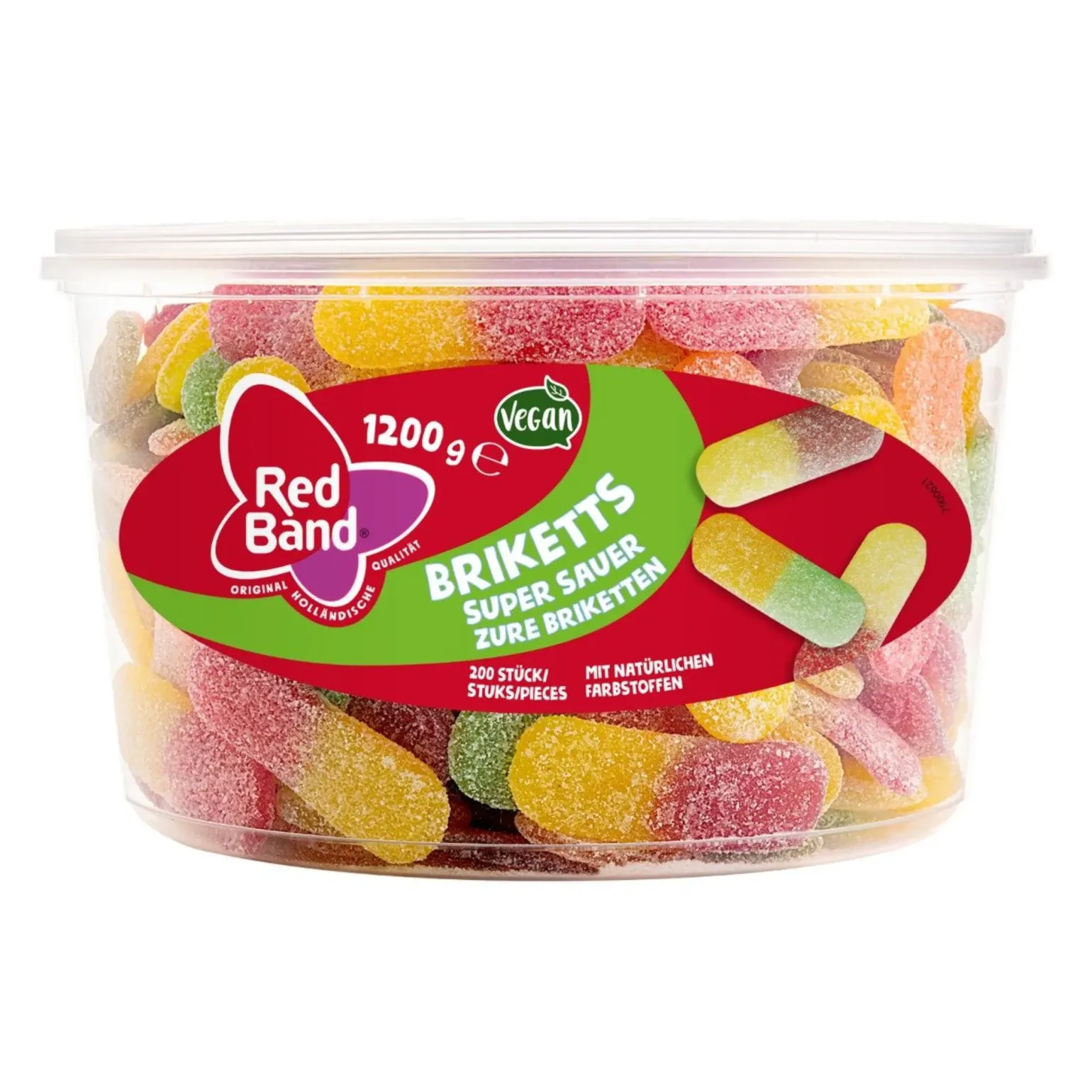 Red Band Briketts Super Sauer zijn fruitige winegums met een krachtige zoet-zure smaak en een baksteenvorm. Deze kleurrijke snoepjes hebben verschillende fruitsmaken en zijn omhuld met een frisse zure suikerlaag die zorgt voor een intense zuurbeleving. De zachte maar stevige structuur geeft een prettige chewy bite, waardoor deze zure winegums populair zijn bij liefhebbers van zuur snoep. De snoepjes komen voor in kleuren zoals rood, geel en oranje en worden verkocht in een grote transparante silo van circa 1200 gram, wat ideaal is voor presentatie in snoeppotten of balies.