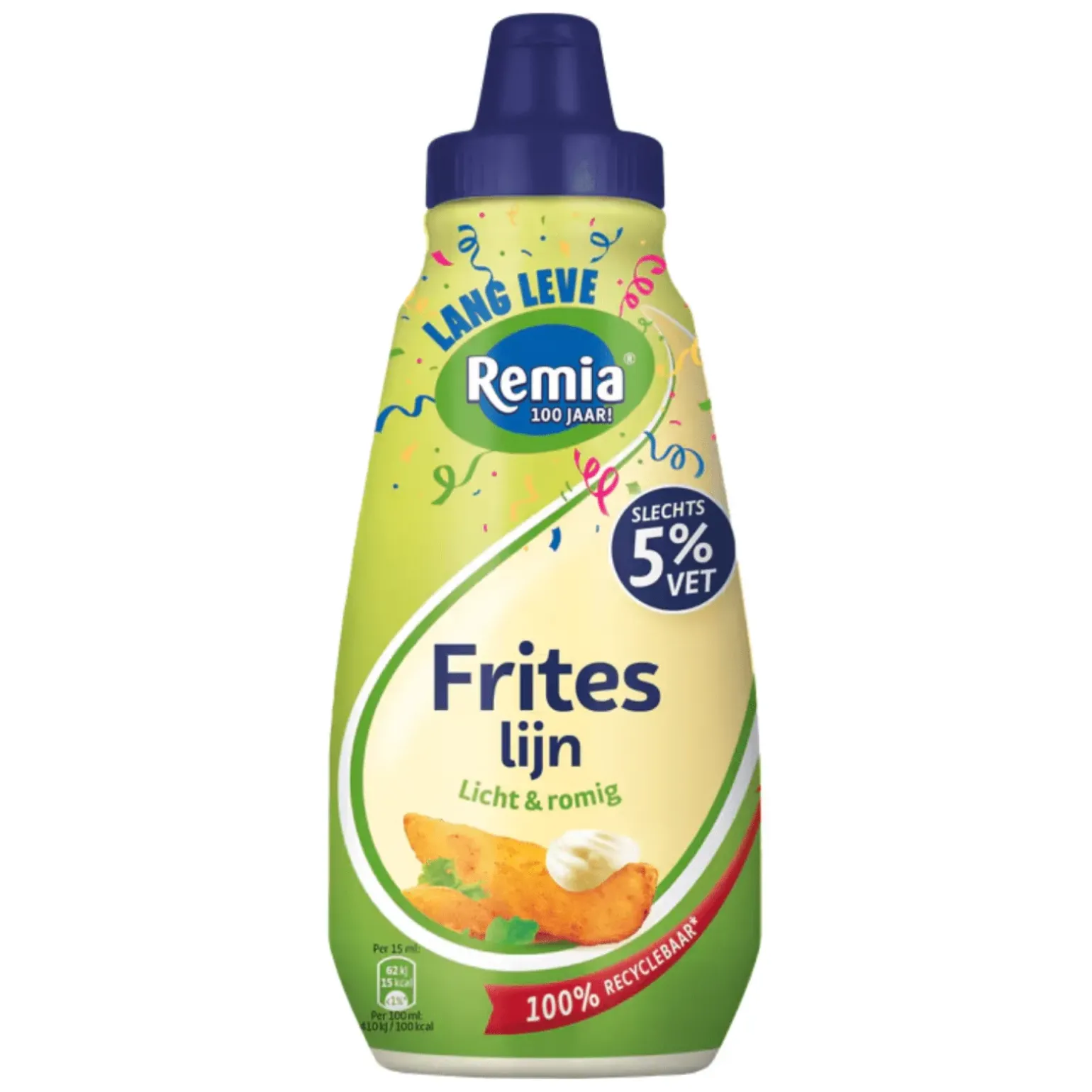 Remia Friteslijn is een romige fritessaus met slechts 5 % vet, ontwikkeld voor liefhebbers van smaak met minder calorieën. Verpakt in een handige knijptube met doseerdop, ideaal voor frites, snacks of salades. De tubes worden per 6 stuks verkocht.