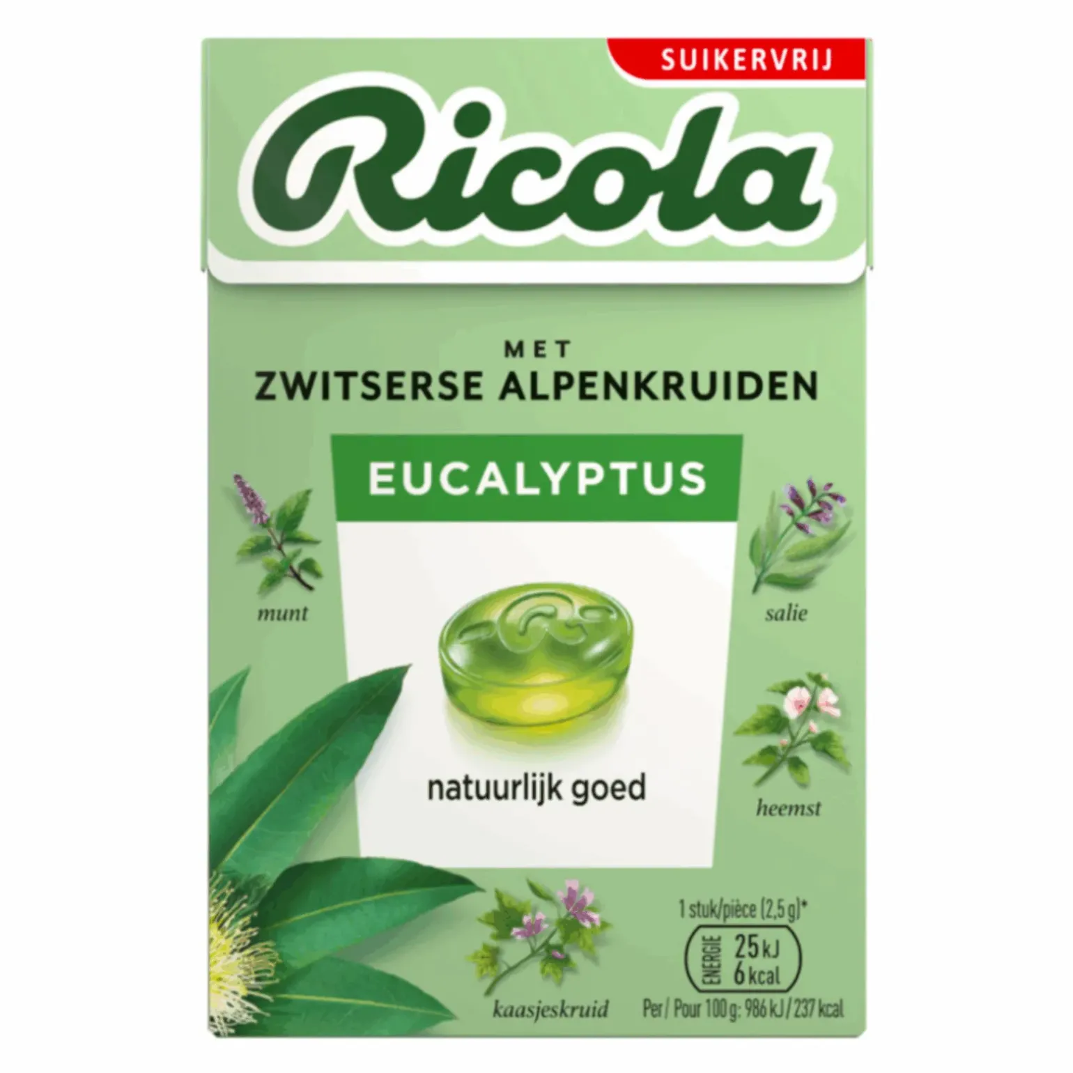 Ingrediënten: Zoetstoffen (isomalt, aspartaam, acesulfaam-K), kruidenextract (0,7%) uit de 13-kruidenmix van Ricola, natuurlijke aroma’s, eucalyptusolie, menthol, kleurstof (bètacaroteen). Bevat een bron van fenylalanine.