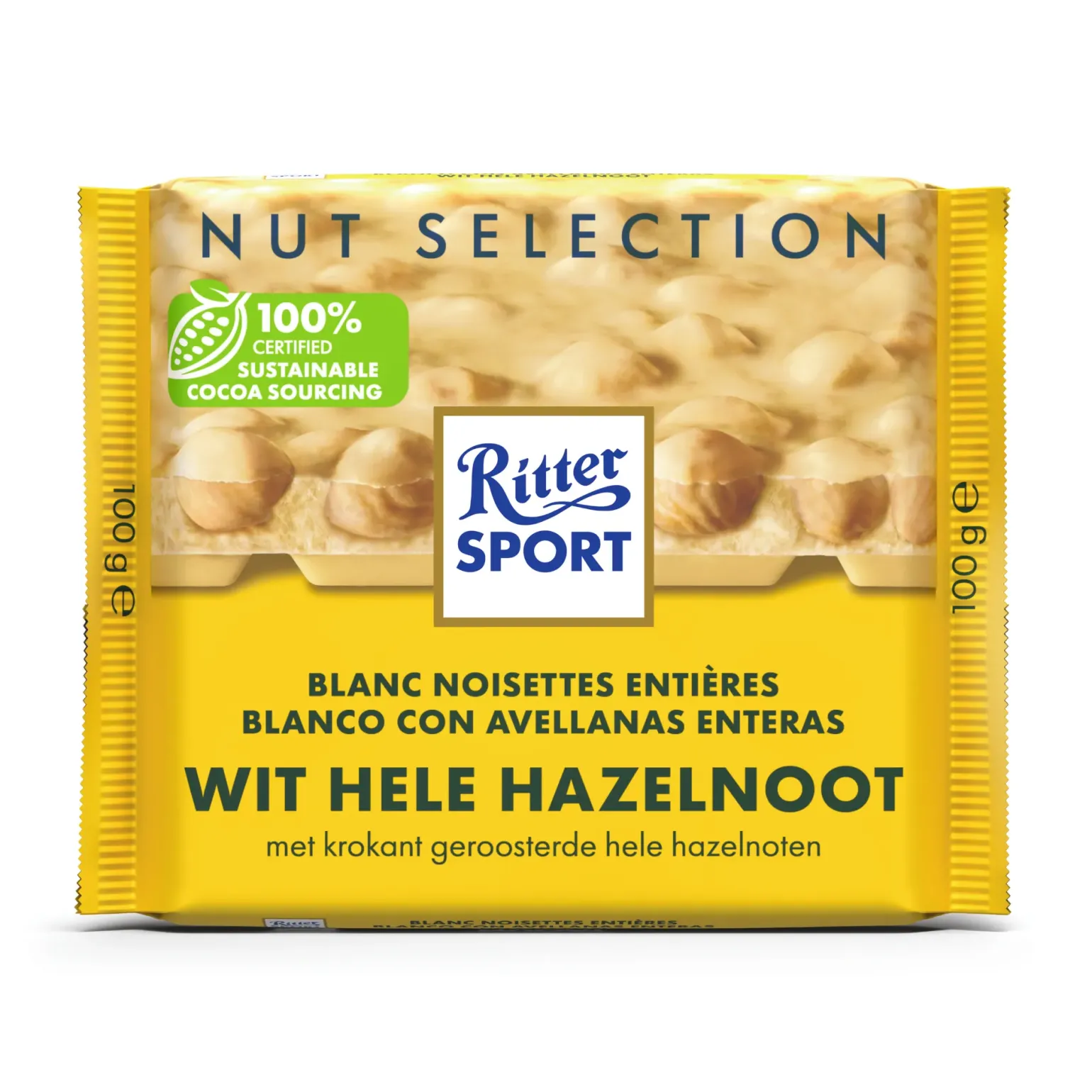 De Ritter Sport Wit Hele Hazelnoot biedt een verfijnde smaakervaring door de combinatie van romige witte chocolade en geroosterde hazelnoten van de hoogste kwaliteit. De zachte tonen van melk en vanille in de chocolade vormen een harmonieus contrast met de stevige beet van de hele noten. Dankzij het compacte, vierkante ontwerp zijn deze repen van 100 gram uitermate geschikt voor een overzichtelijke voorraadkast of een nette presentatie bij de koffievoorziening.